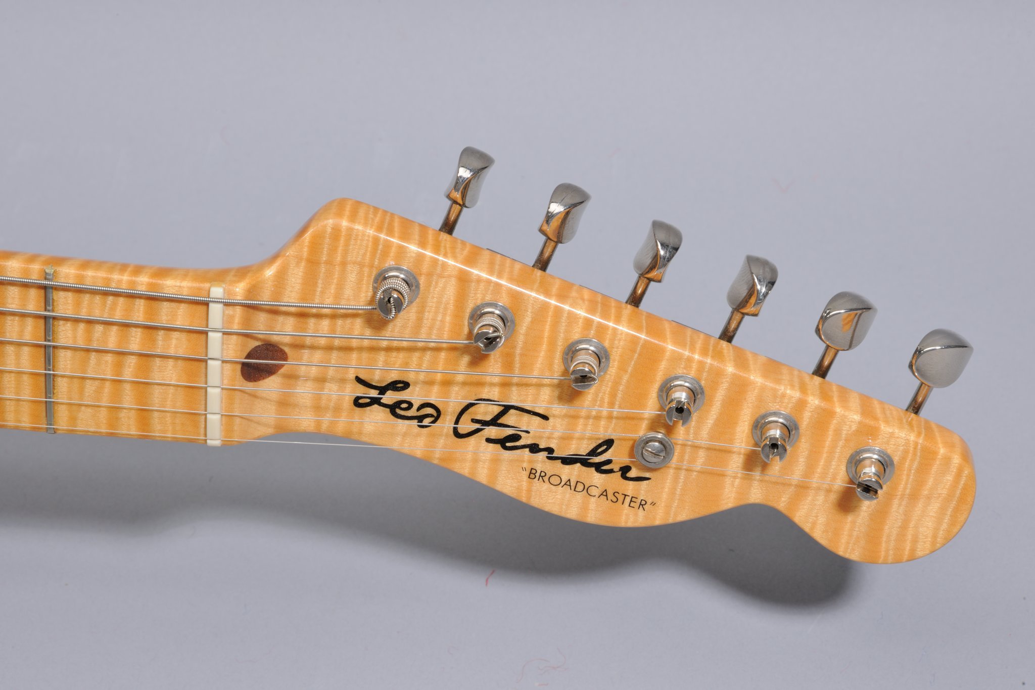 Before it was christened the Telecaster®, Fender's famous trademark design guitar was named the Broadcaster. Fender Musical Instruments, with the accompaniment of BBE Sound and Fred Gretsch Enterprises, introduces a limited edition Leo Fender Commemorative Broadcaster guitar. Fifty of these special tribute instruments were reproduced according to Leo's original design and materials from 1950. Number 001 went to the Fender Museum. 002 went to Phyllis Fender 003 went to Fred Gretsch. And, 004 went to BBE Sound, then owner of G&L. The first rendition of this guitar was named Esquire® and featured a single pickup and no truss rod. After limited production and field testing, Fender realized the apparent need to reinforce the Neck and began plans to fit the Neck with a truss rod. By the time they were ready for full production, the decision was made to also include a second pickup. Eager for an entry into new markets, especially on the east coast, Don Randall, Fender's head of sales, chose a new name for the dual pickup version of the Esquire and named it the Broadcaster. So, without hesitation, Fender began shipping the new, improved dual pickup Broadcaster in place of the original Esquire. By attempting to give the Esquire its new name in such haste, Fender had caused unforeseen trouble. On February 20, 1951, the company received a telegram from the Fred Gretsch Manufacturing Co., stating that use of the Broadcaster name, was an infringement upon Gretsch's registered Trademark used on their Broadkaster model drums, and that abdication of this name was warranted.