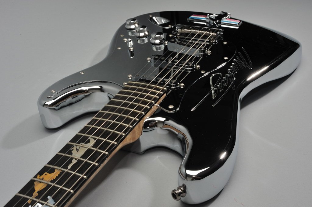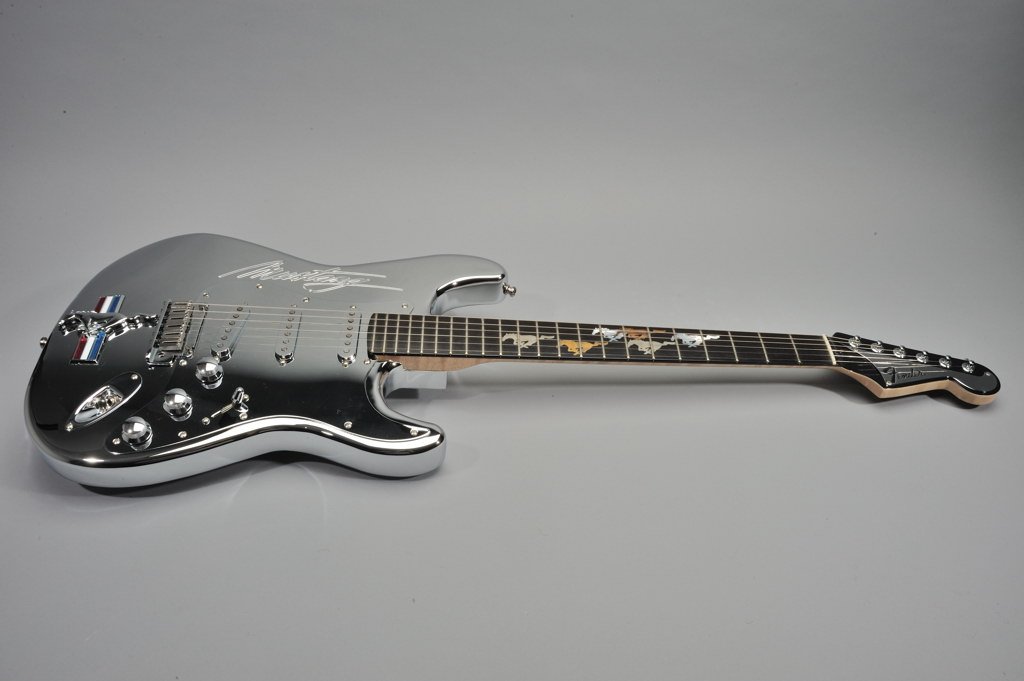 The custom Strats are chromed aluminum guitars, and feature “Running Mustang®” inlays on their ebony fingerboards. To top that, Fender® added an original Mustang® emblem just behind the tailpiece, and original Mustang® radio knobs for the volume and tone controls. Fifteen of the guitars went to lucky concert -goers, one for each stop of the tour, while one very special winner took home the Mustang®.