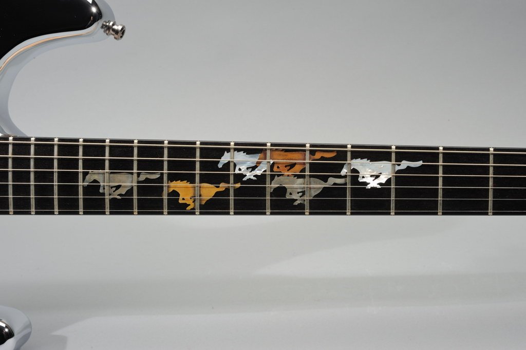 1 Piece Birdseye Maple Neck with Ebony Fretboard inlaid with Running Mustangs cut from Various Metals and Mother of Pearl.