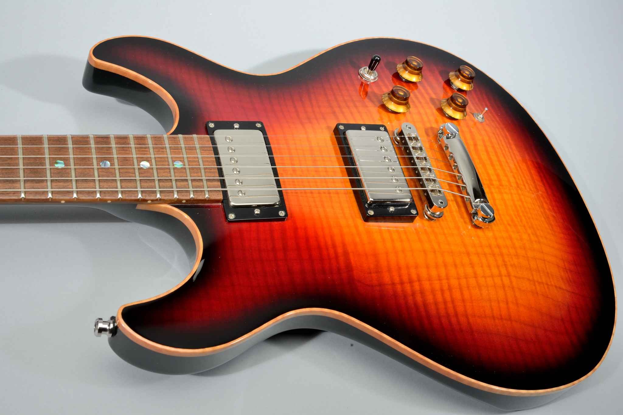 2 Piece Flame Maple Top in 3 Tone Sunburst Finish with Faux Binding