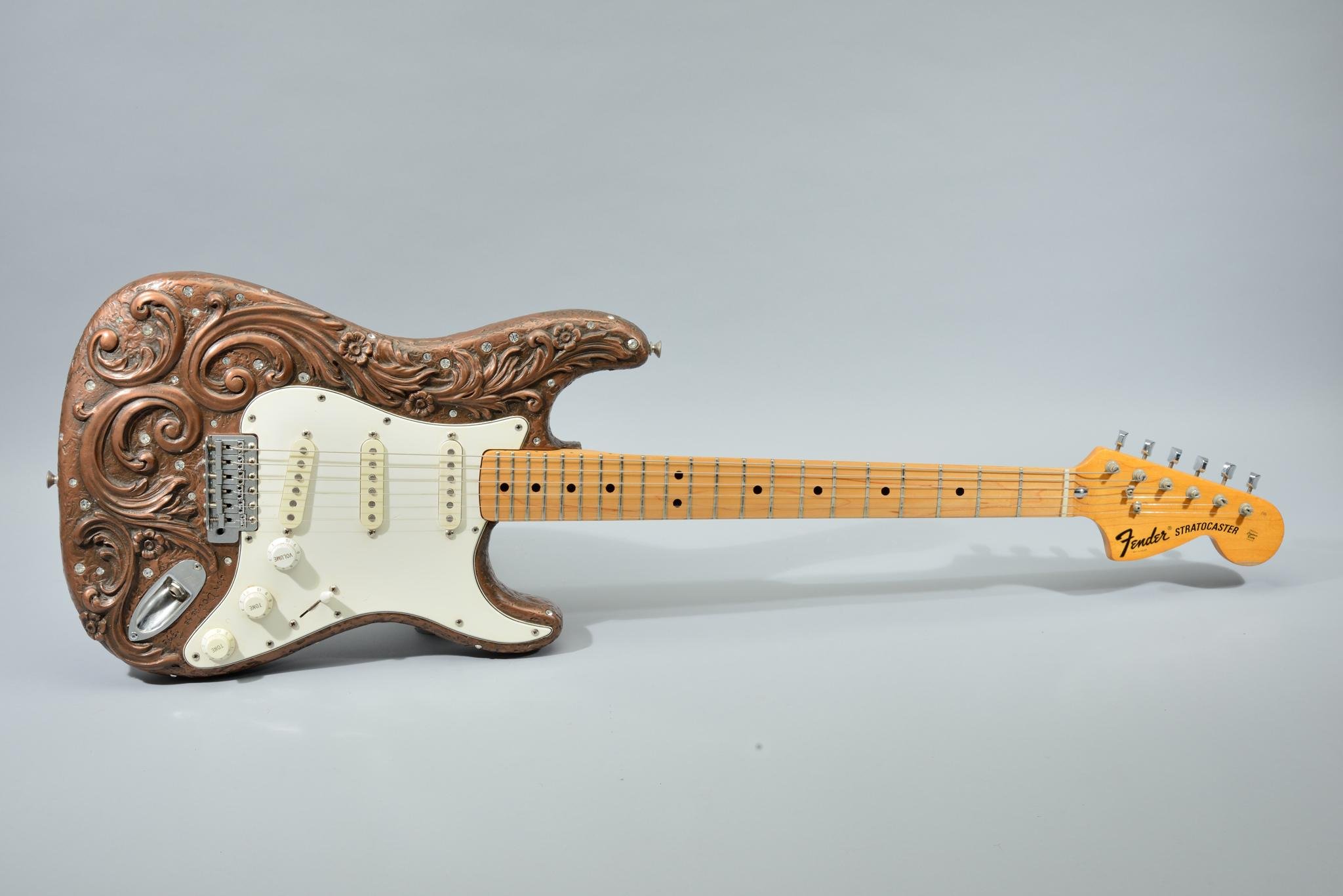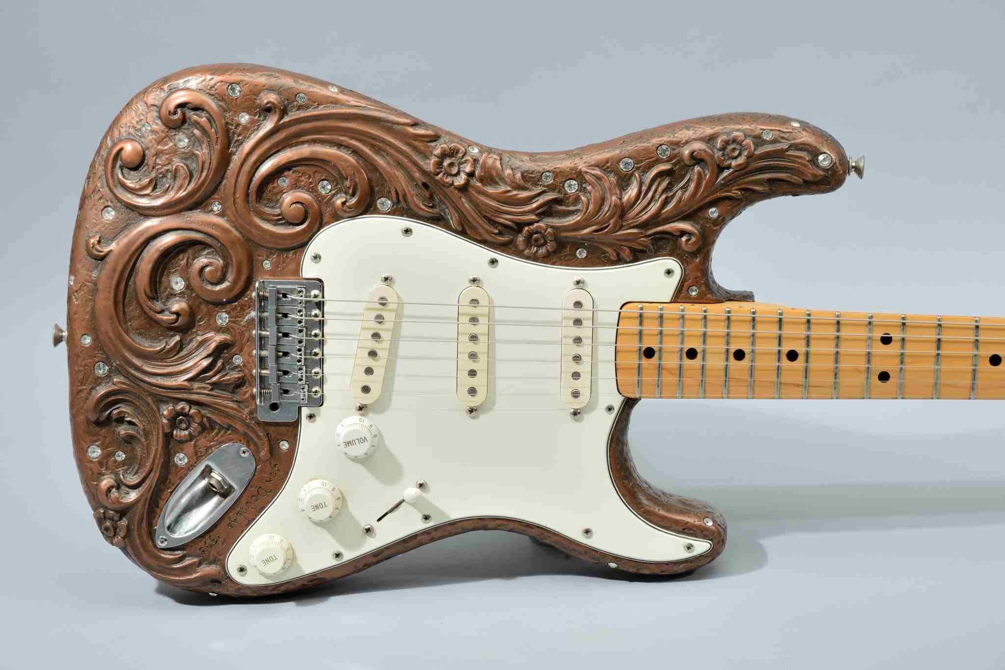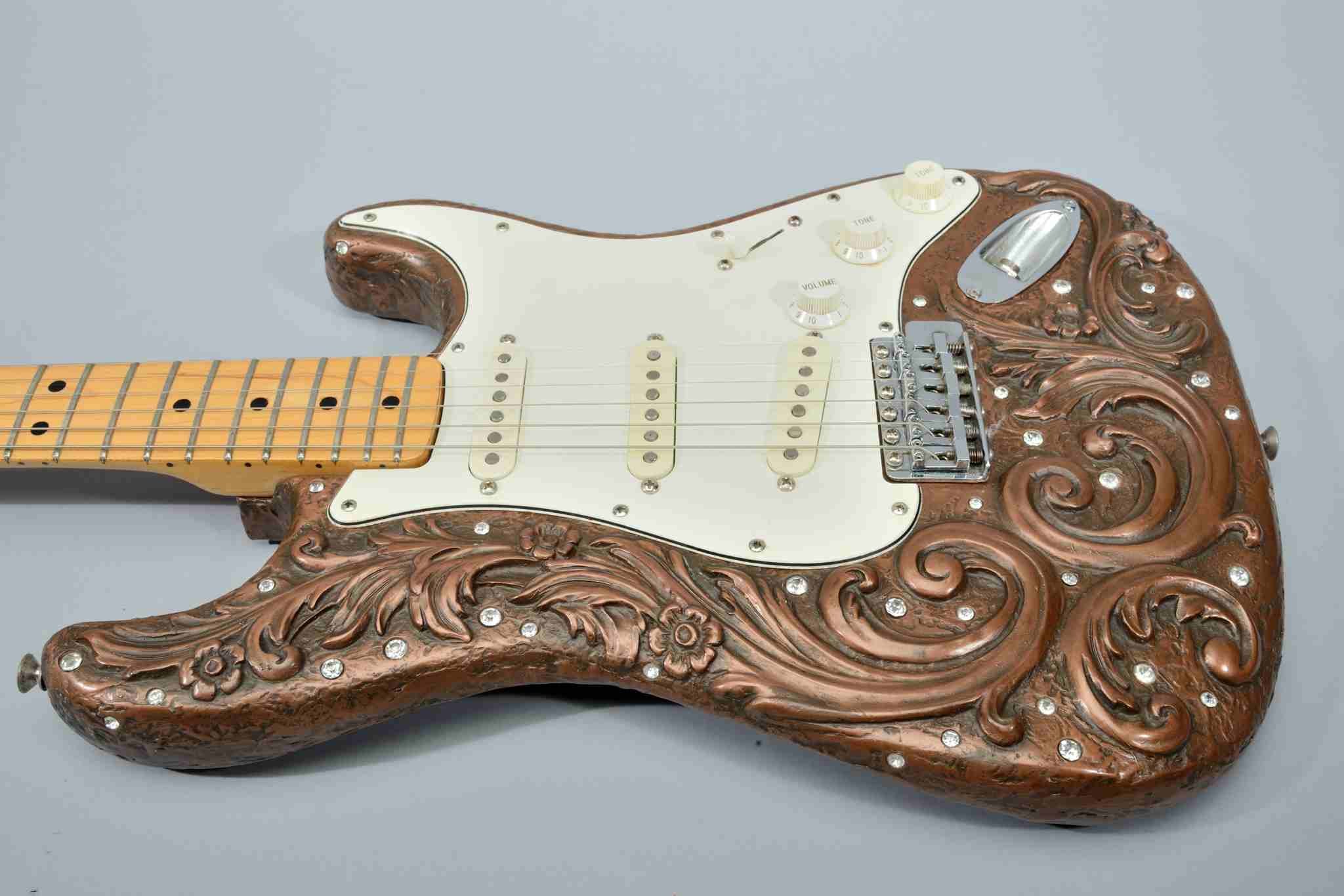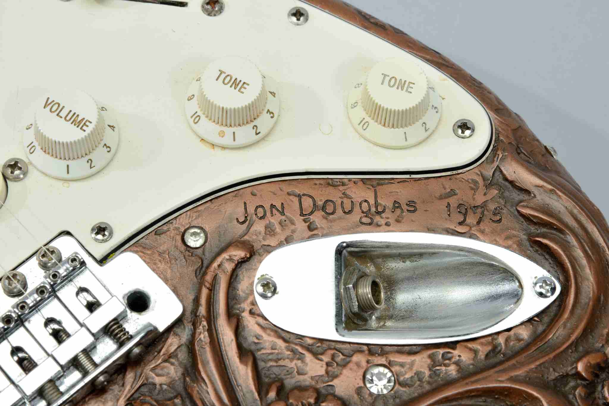 In 1975, Ivor Arbiter, the UK Fender® distributor, sanctioned Douglas to design a "non-boring Strat®". Douglas created a prototype Strat® body of cold-cast bronze, employing a metallic layer over a fibreglass shell. After a suggestion from Arbiter, Douglas set rhinestones into the body's surface providing the Legendary name “Rhinestone Strat”. Douglas used all 1975 Fender® Strat® parts.
