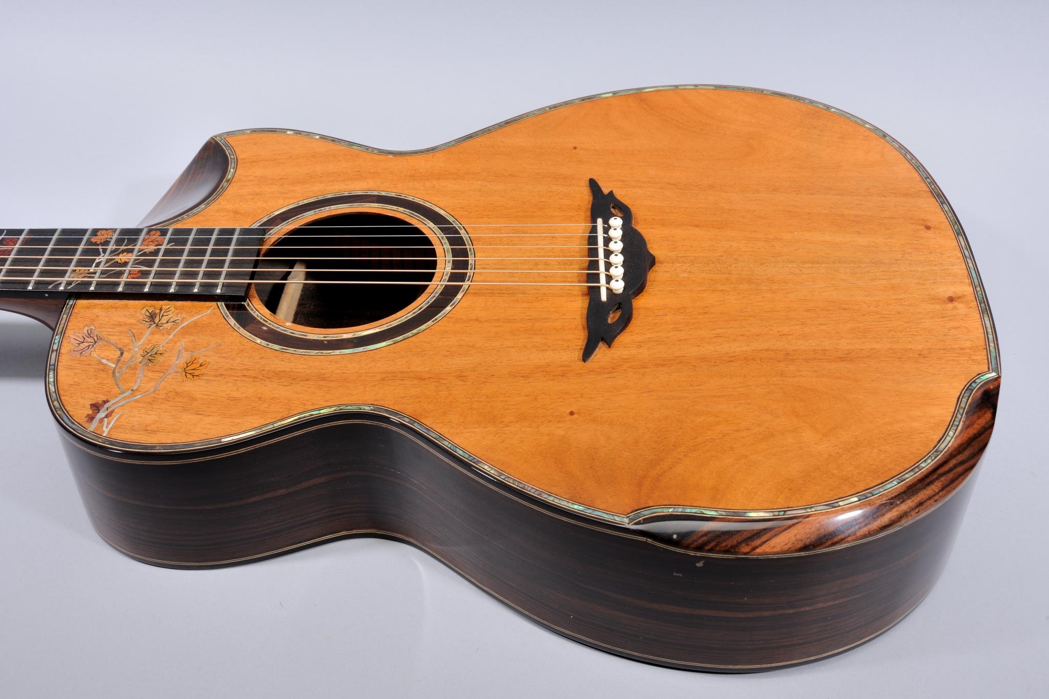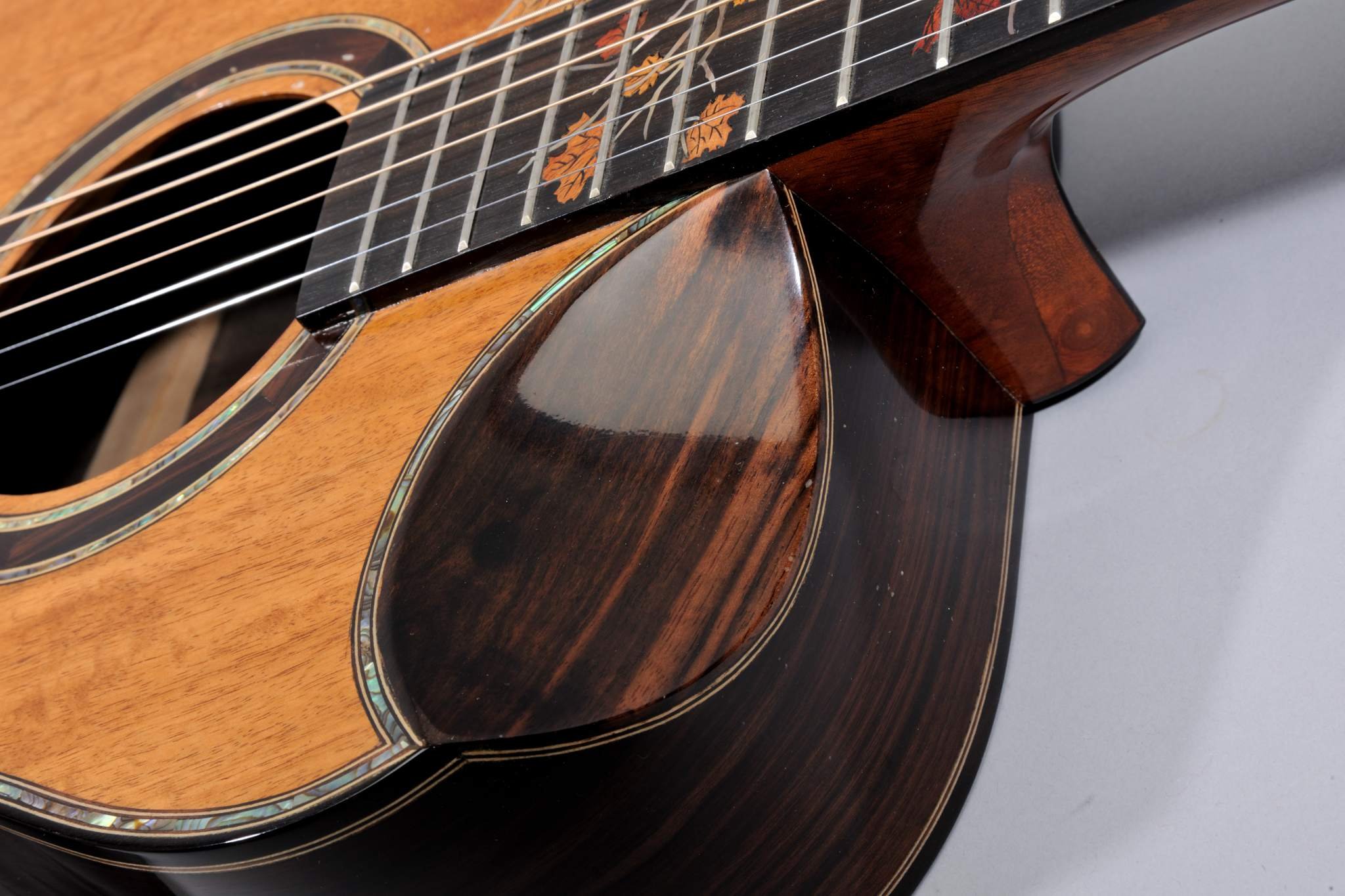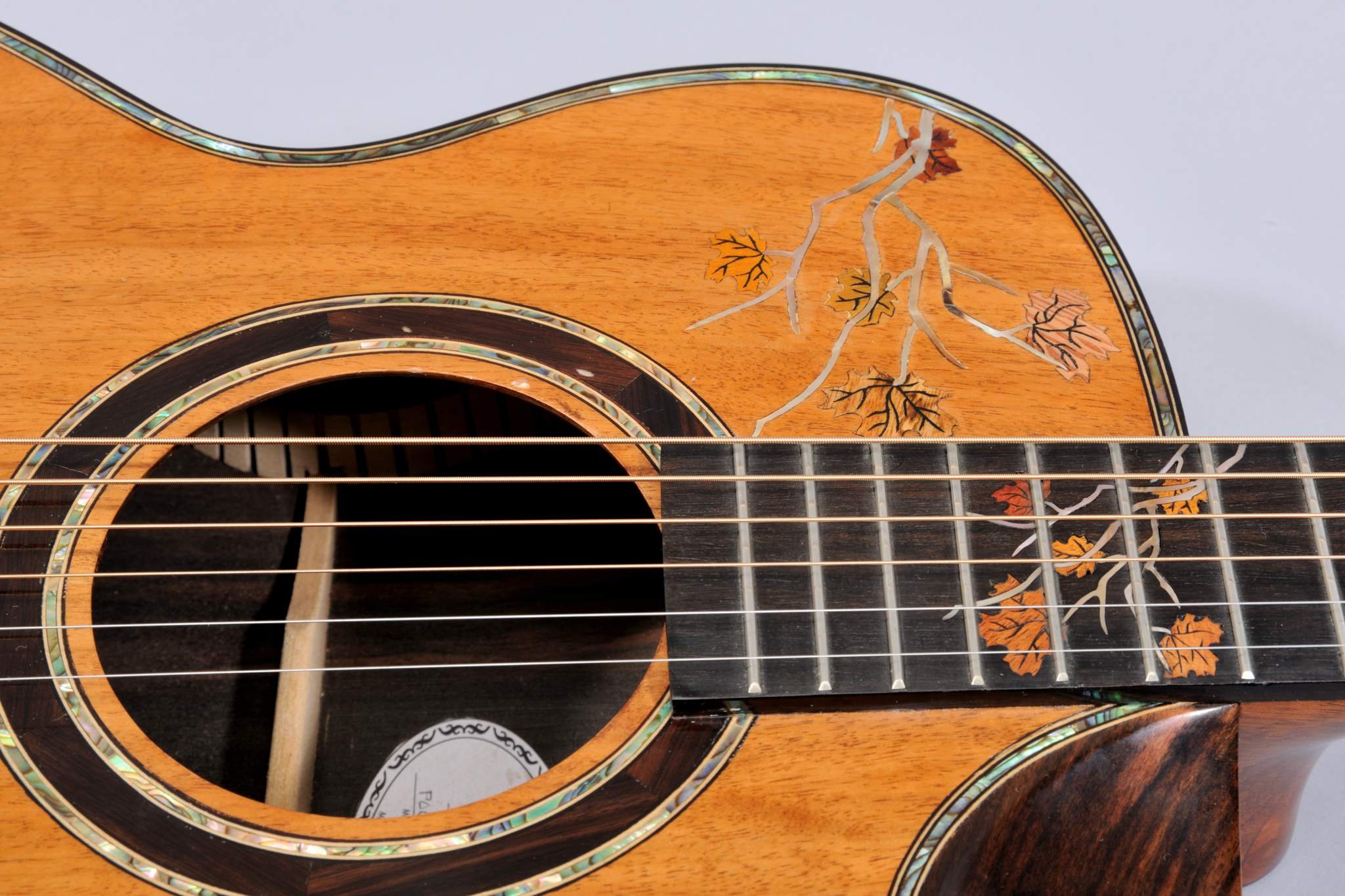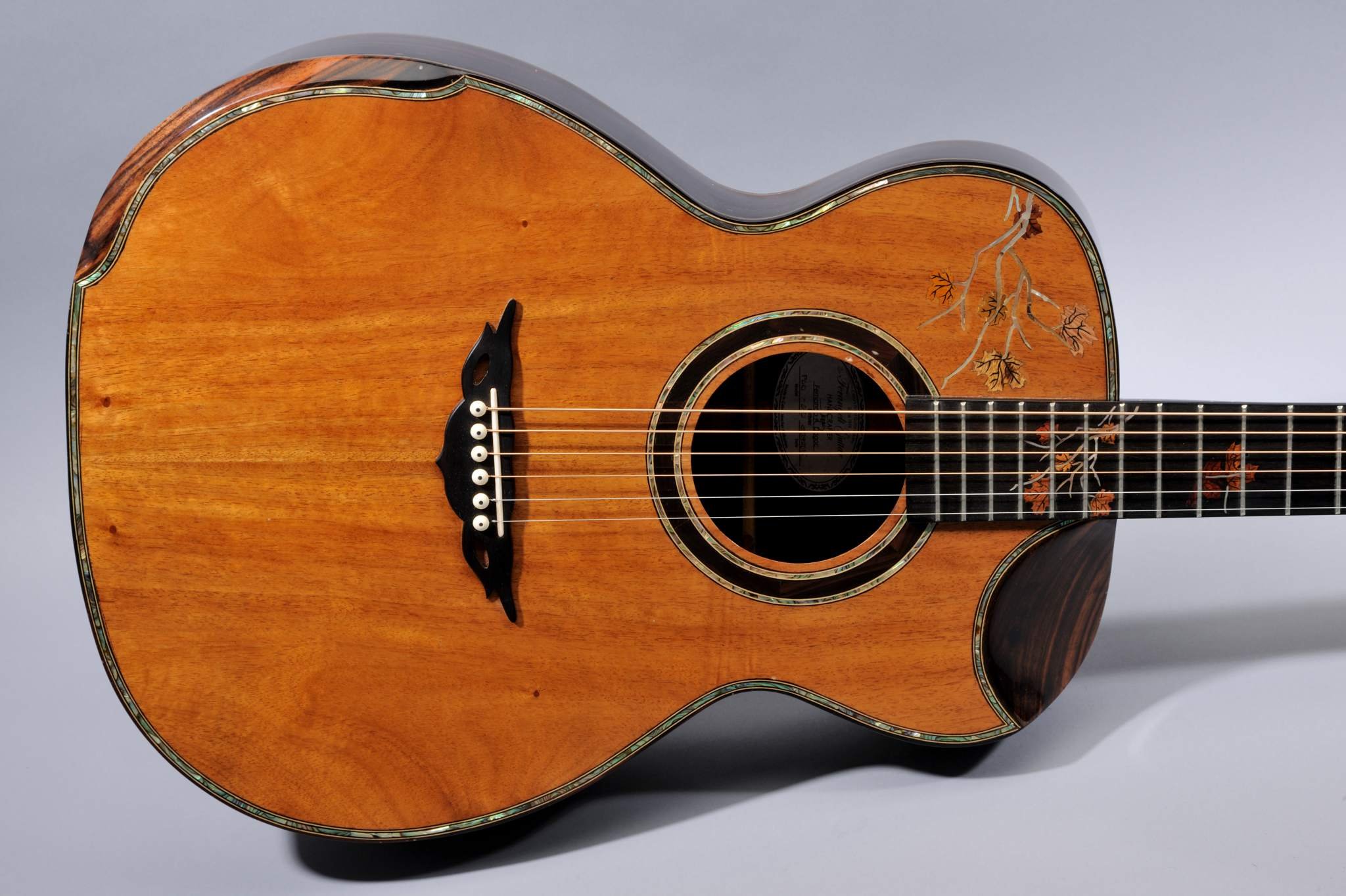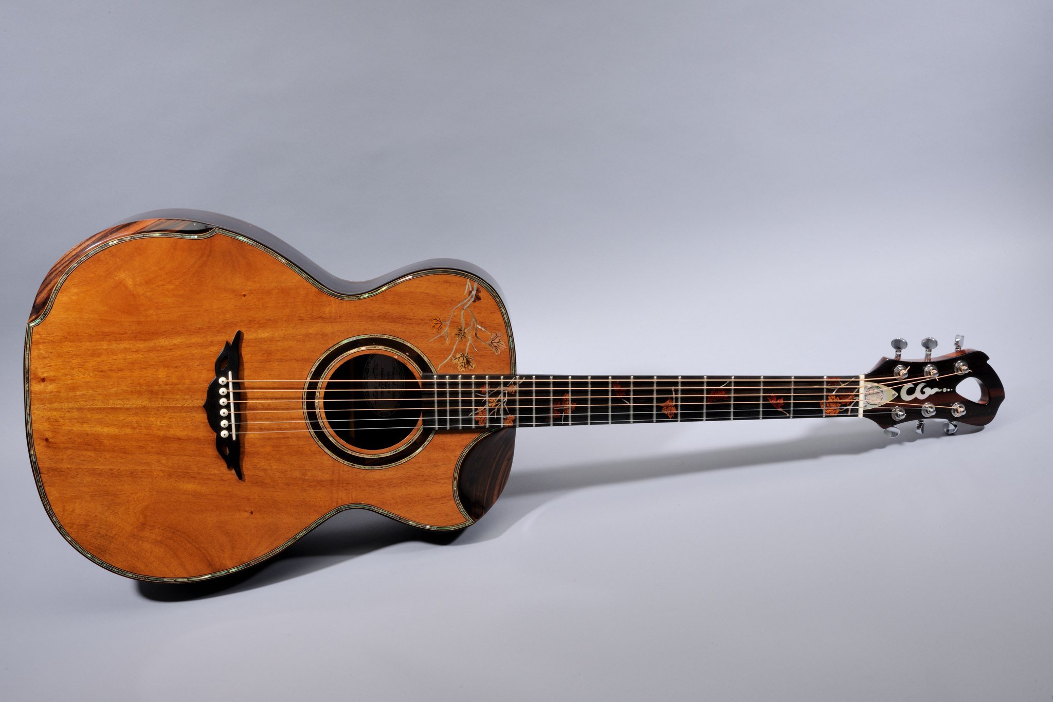 2 Piece Koa Top with Abalone Binding and Leaves Inlays.