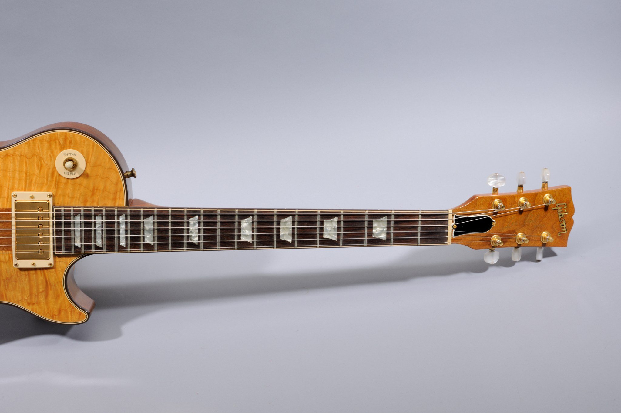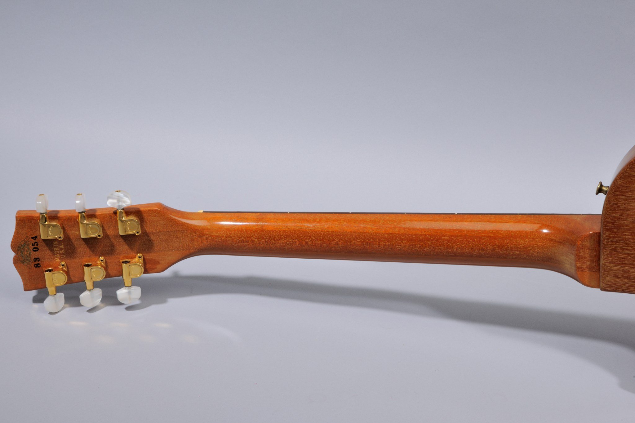 The ANT model (antique natural) came with a "...highly-figured curly maple top," brown binding with two cream pinstripes on the body and one cream pinstripe on the neck, a walnut head veneer in light stain with Gibson logo inlay, and individual pearloid kidney-shaped machine heads. ANT models are definitely the more exotic-looking of the two because of the color, contrasting dark binding, and less-common tuner buttons. Among the ANT models on the market there is less variation in color (all are antique natural, some more gracefully aged), but again, the grade/quality of the curly maple tops and the attention to bookmatching is highly variable.