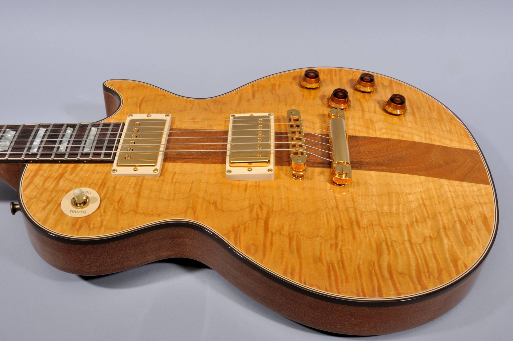 The Spotlight Special is instantly recognizable by the contrasting strip of walnut down the center of the body, with curly maple or quilted maple on both sides of the strip. It has a gold Custom Shop logo on the rear of the headstock, with an inked serial number of 83-XXX, with "XXX" ranging from 001 to 211.