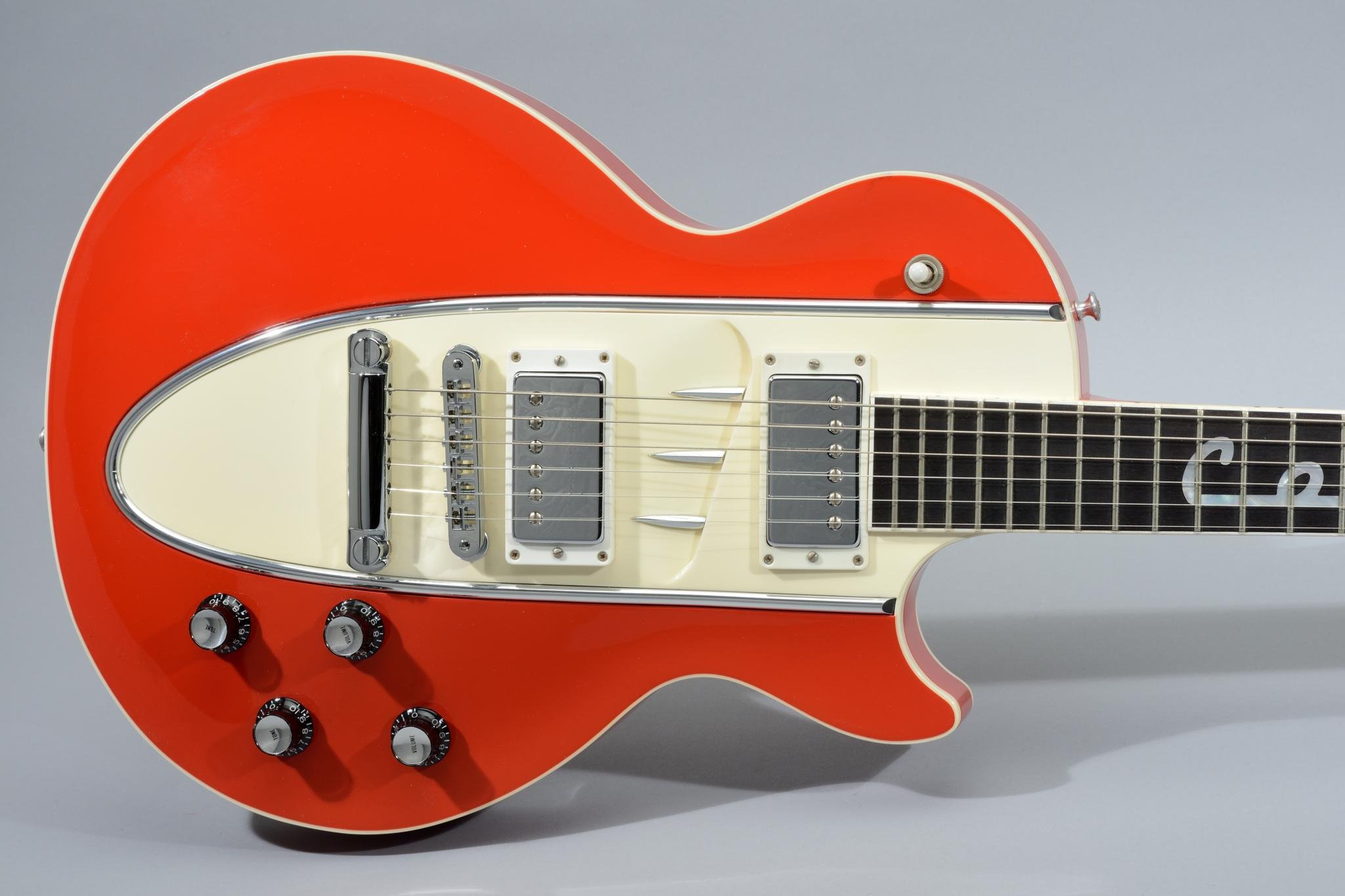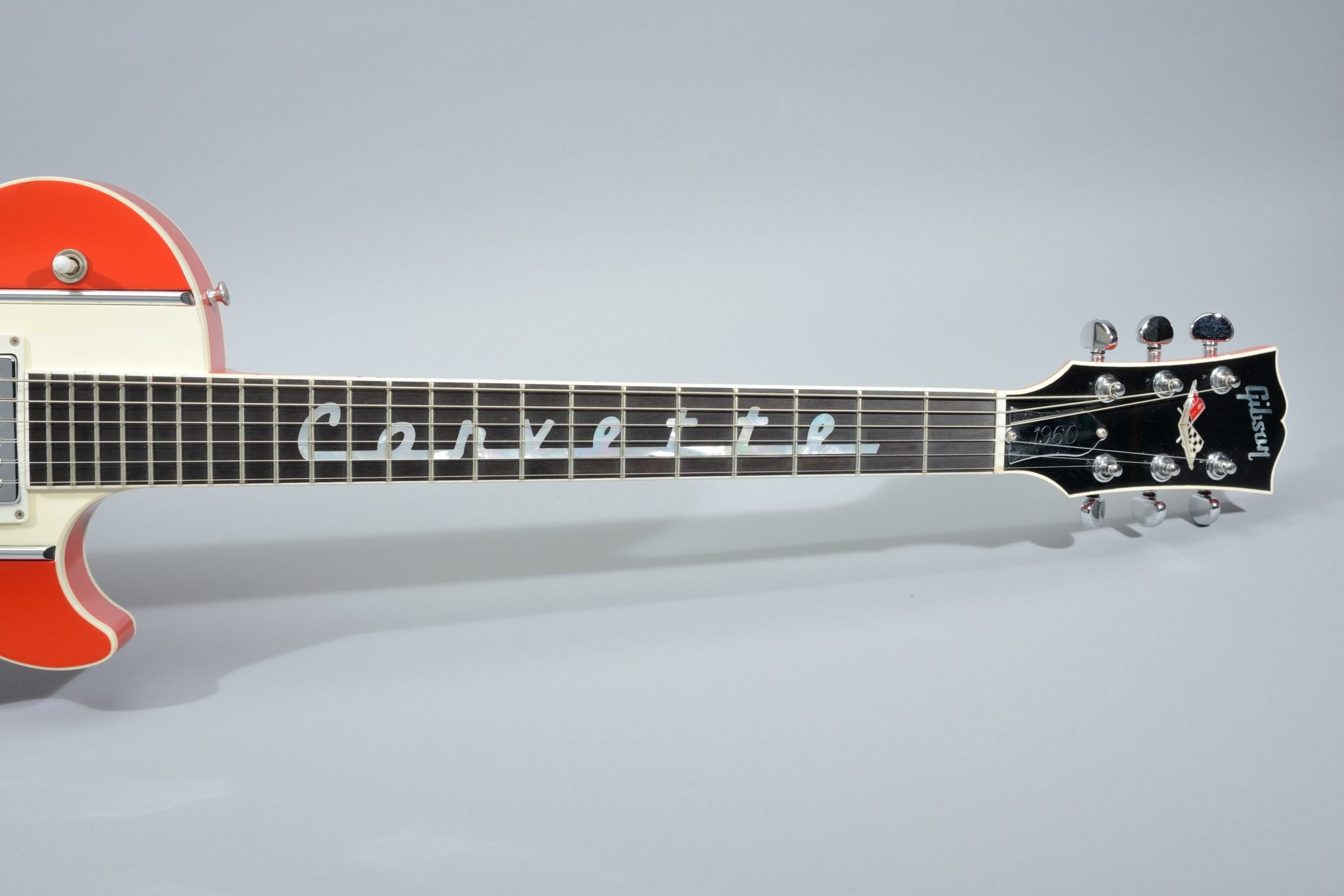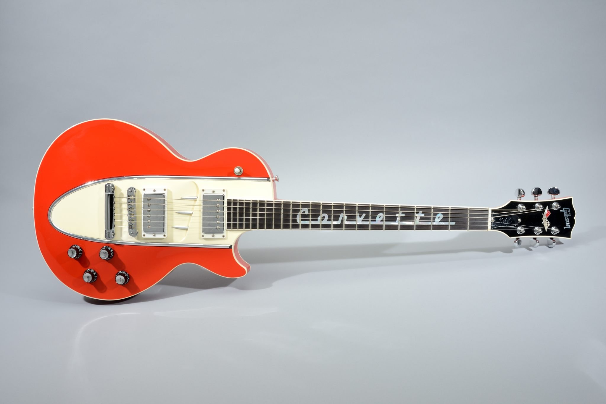 The Corvette was produced in 1995 to commemorate the 42nd anniversary of General Motor's Chevrolet Corvette and Gibson's Les Paul's 43rd anniversary. The ebony fretboard inlayed with pearl Corvette script from 1960. The headstock is inlayed with the Chevrolet Corvette crossed flags. The back cover plates and truss rod cover are engraved chrome plated brass and the pickup covers are engraved with ''283'' and ''fuel injection'' in the original script. The maple top is hand carved to simulate the famous side scoop of the 1960 Corvette.