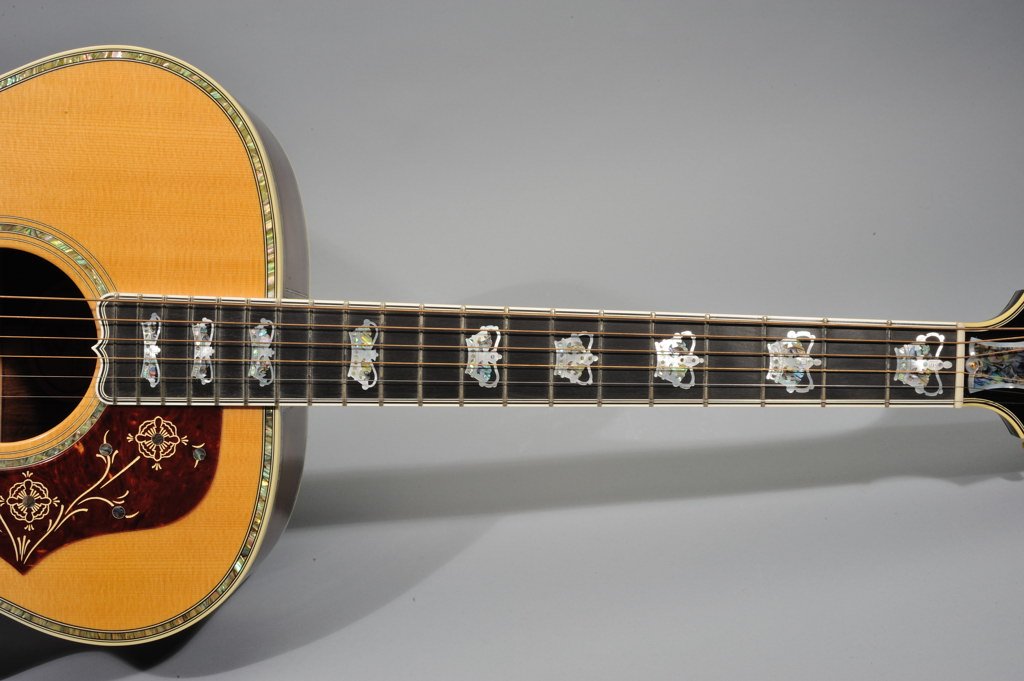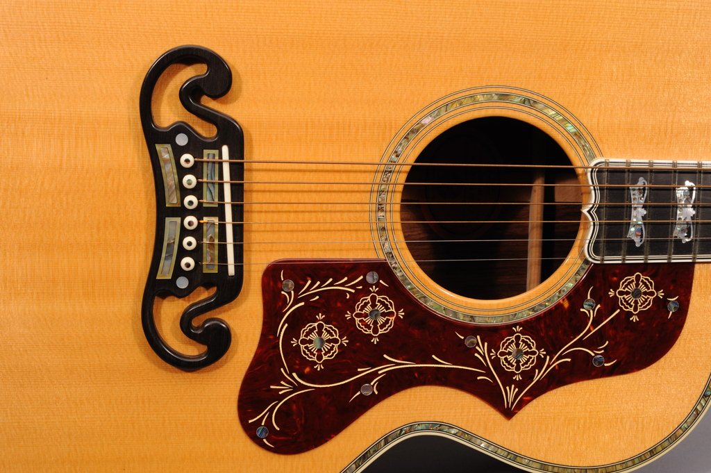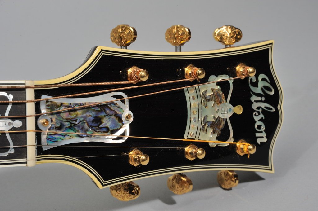 Headstock with Black Overlay Inlaid in Abalone with the Early Fancy Gibson Logo and Monarch Crown Ornamentation.