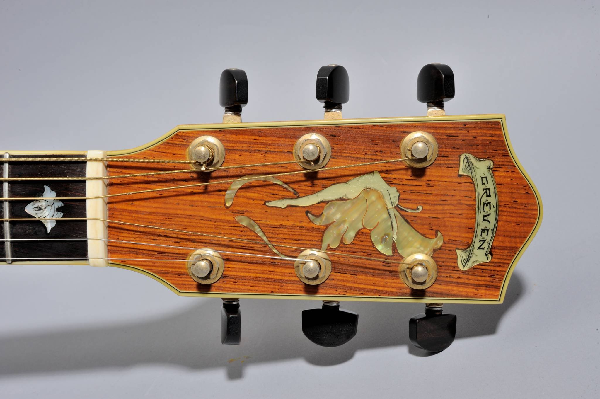 Headstock with Brazilian Rosewood Overlay Inlaid in MOP with the John Greven Logo & an Engraved Cartouche.