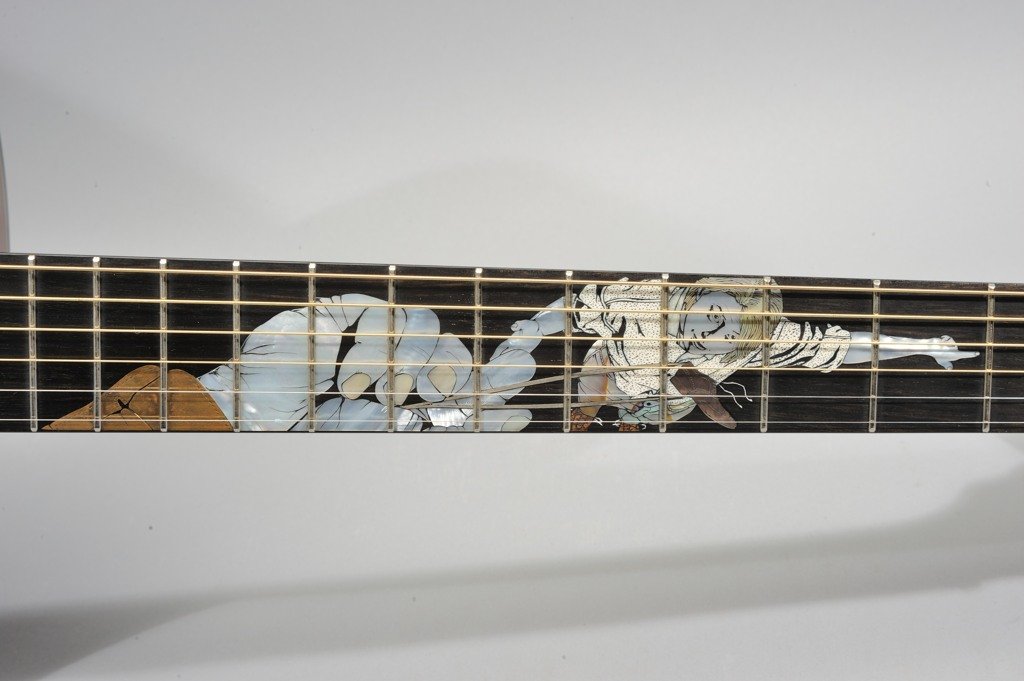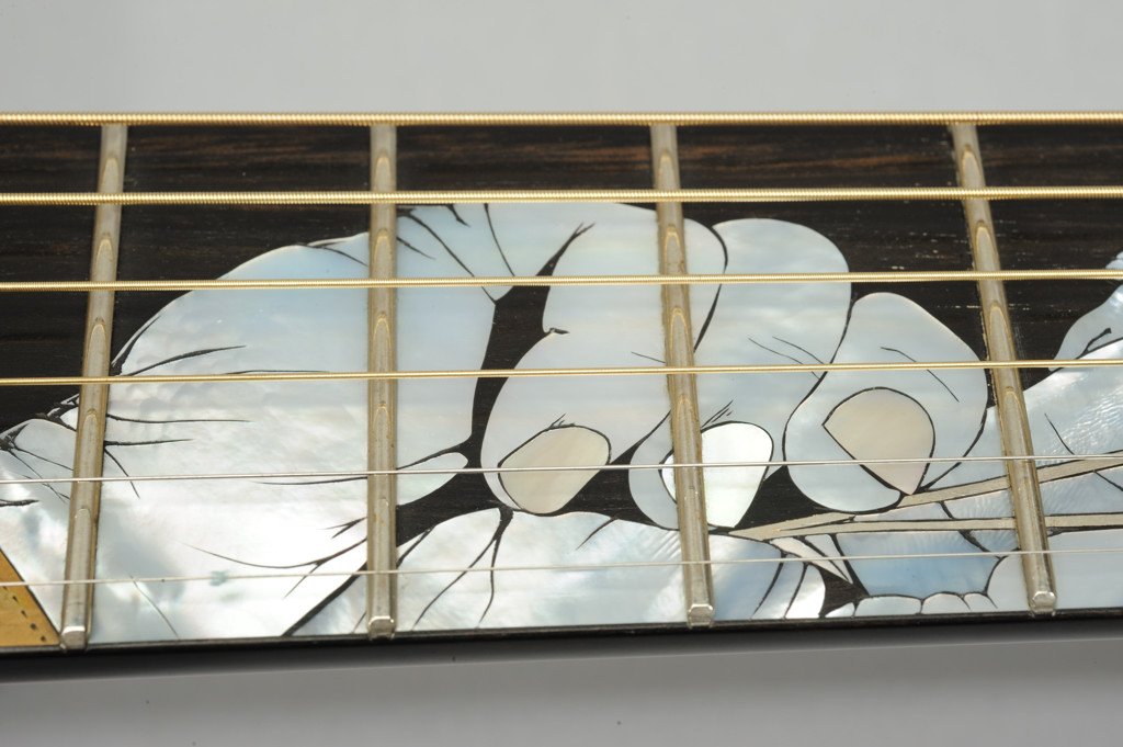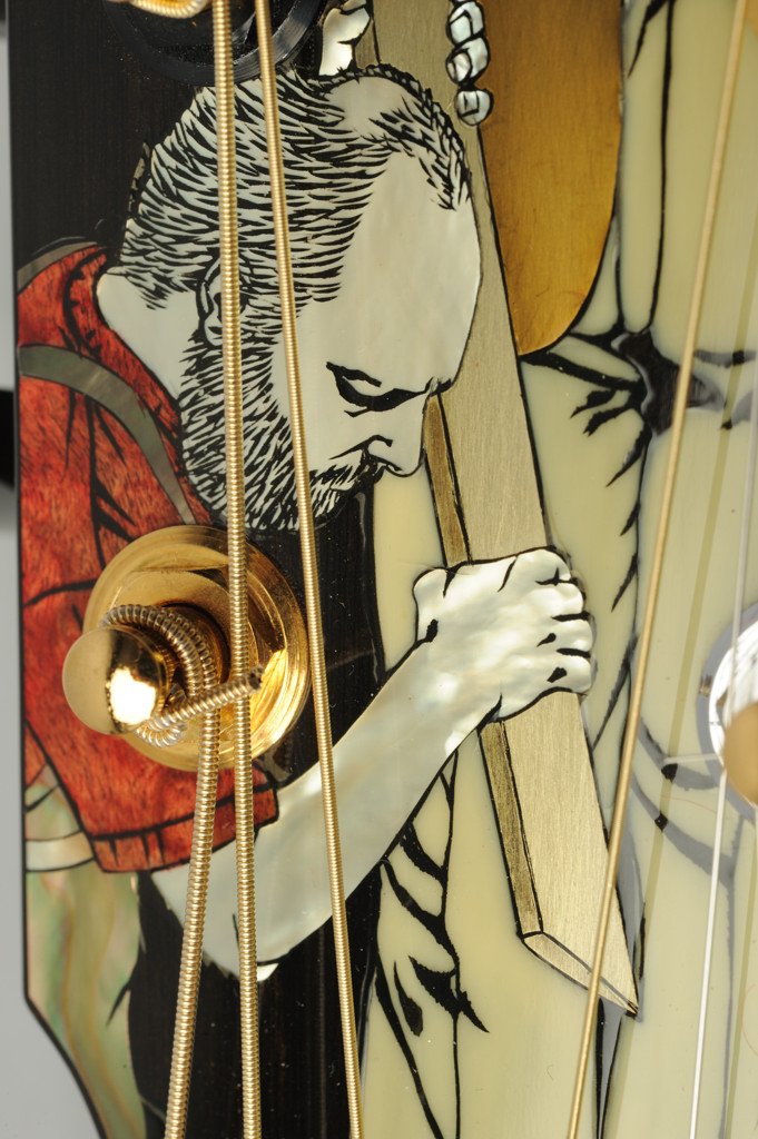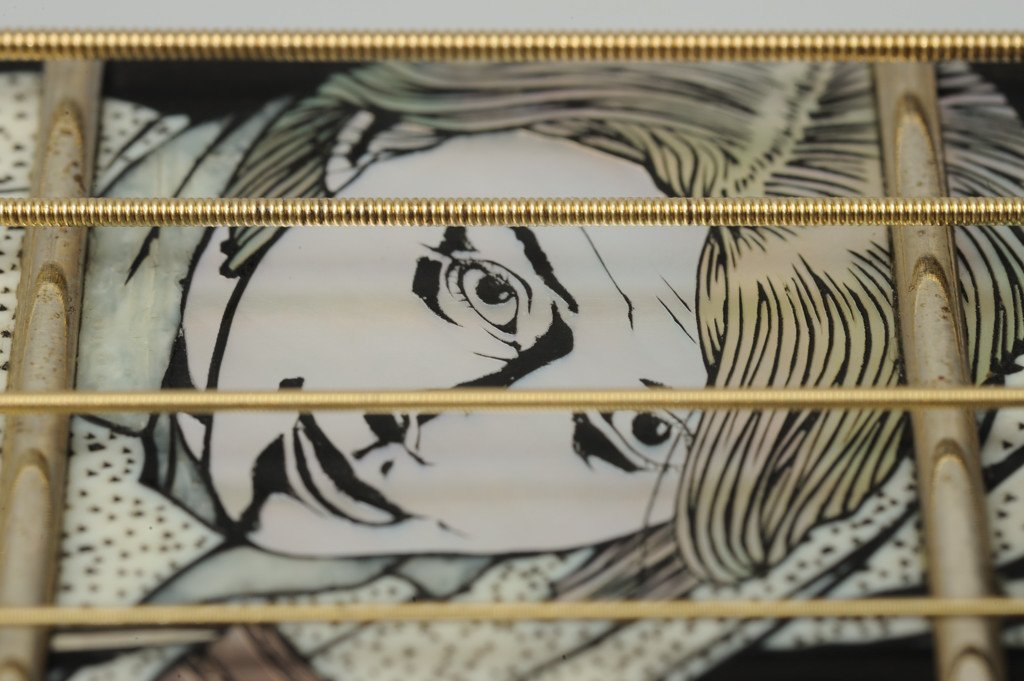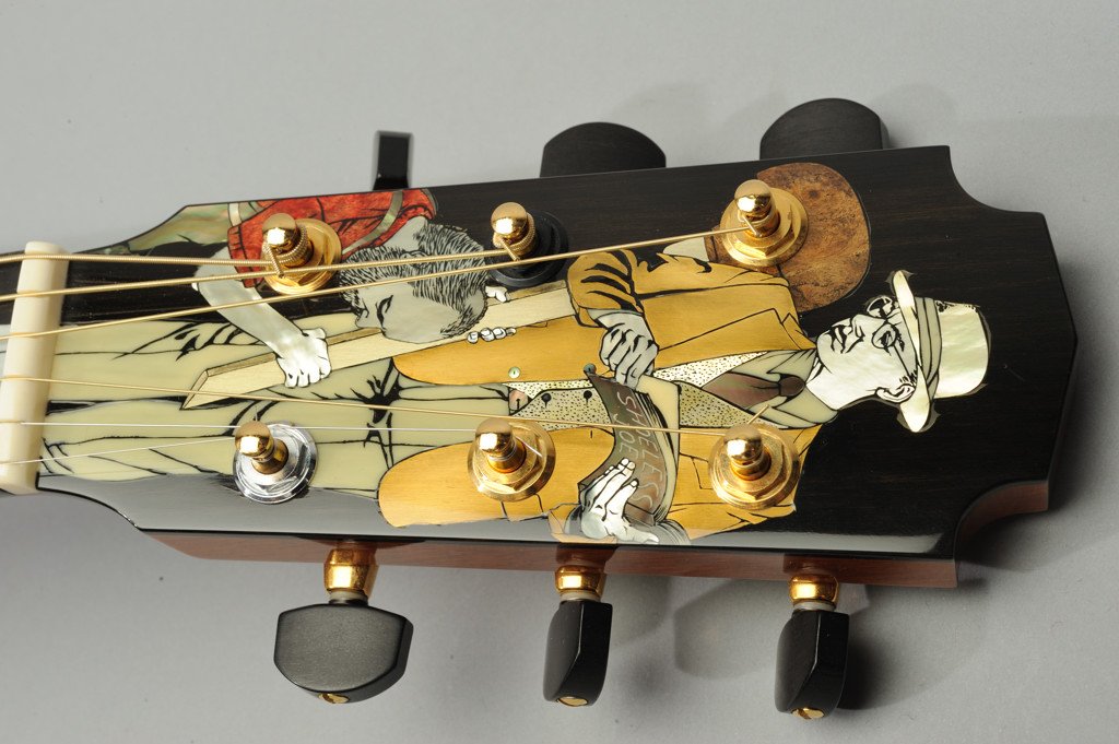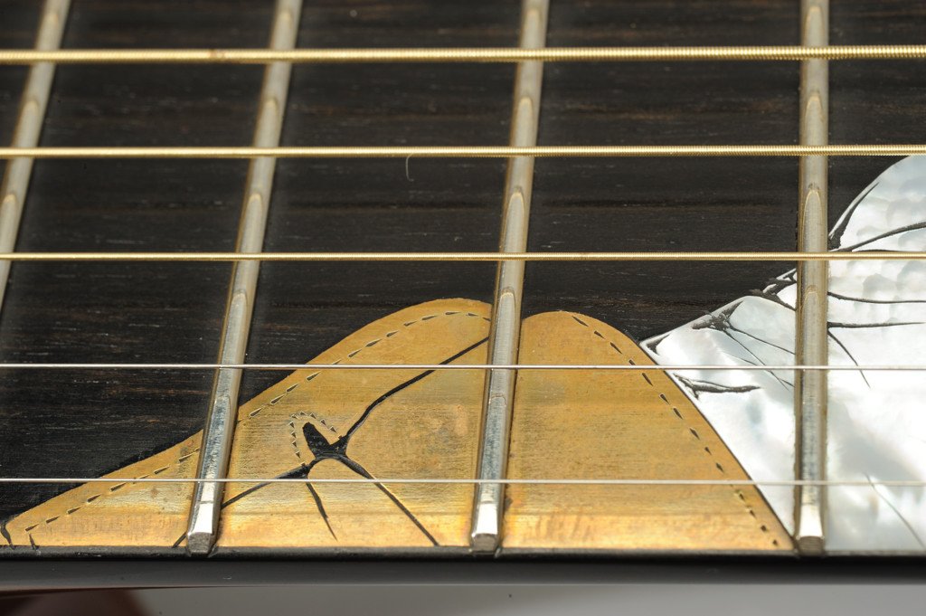 In addition to building the instruments, Laskin uses them as “canvases” for his engraved inlay art. He is now internationally acknowledged as having single-handedly taken the tradition of musical instrument decoration beyond the purely decorative. For Laskin, the inlay medium has become a tool for communication, not merely embellishment. “I don’t see inlay as a decoration, but as a canvas,” Laskin says. “My goal is to tell a story, convey a feeling, communicate. I don’t think, ‘Here’s some ebony, let’s throw some shell in there.’ I think, ‘Have I told a story?’”