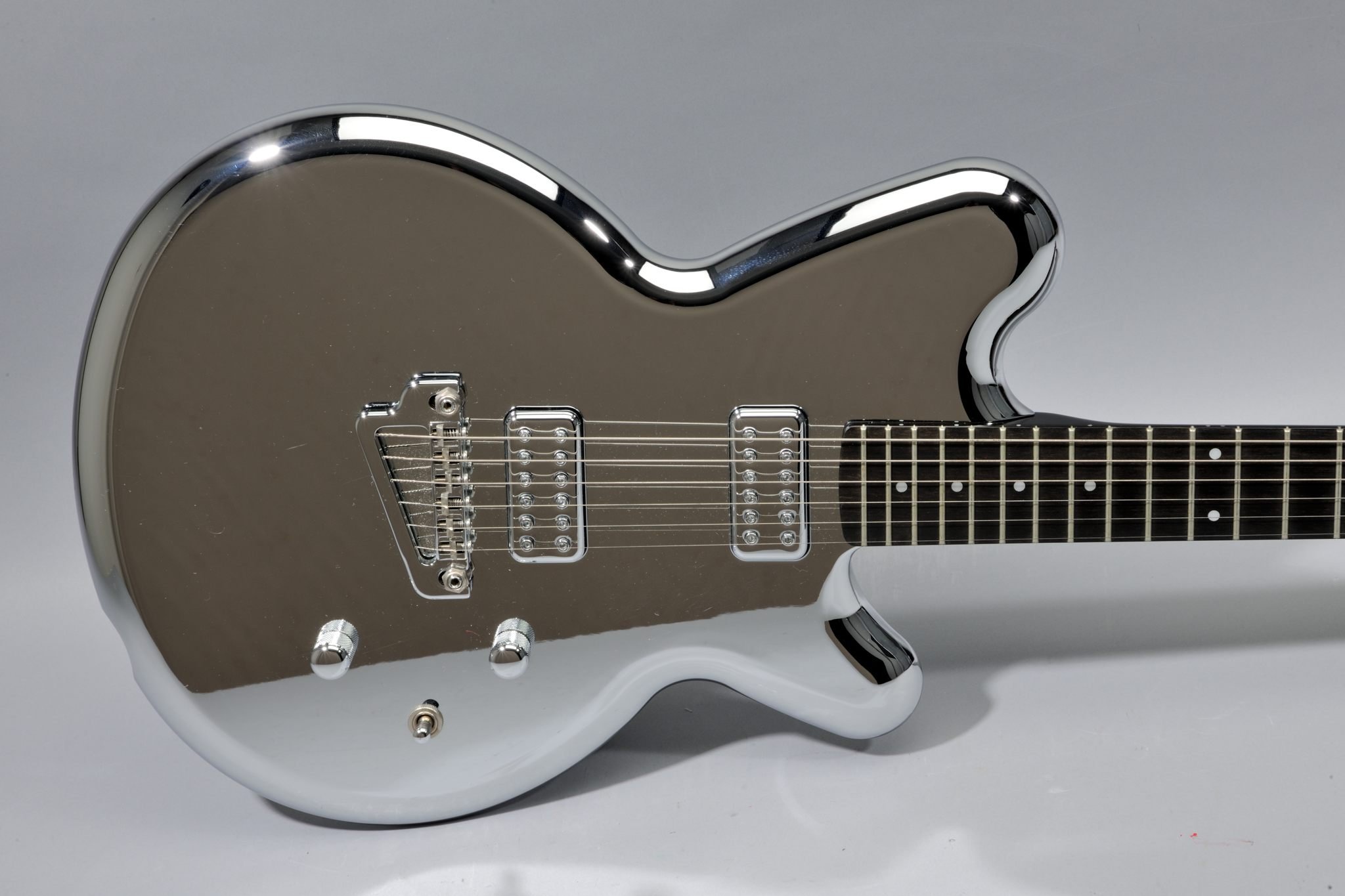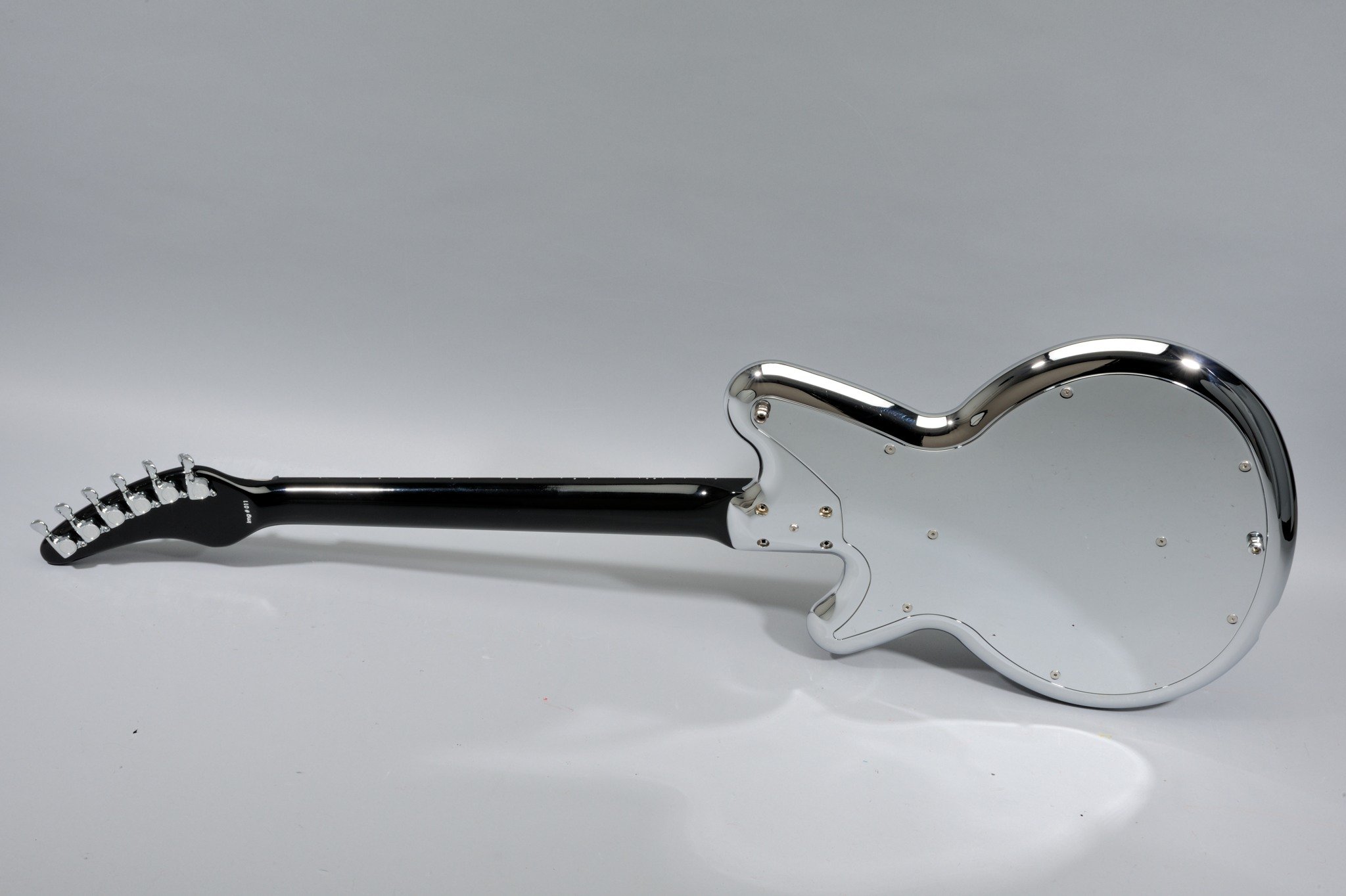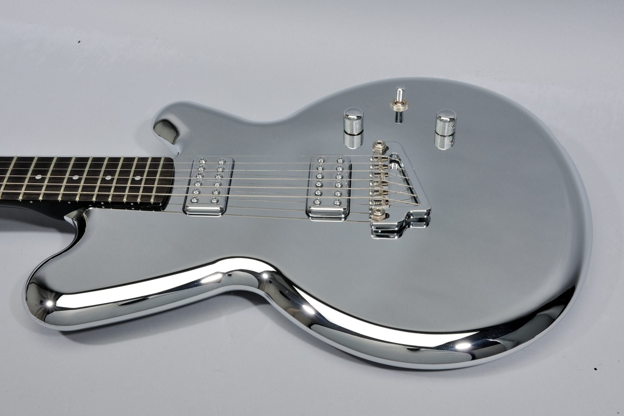 We build exceptional guitars. We build metal bodied guitars, that are either chrome, machined etched surface treatment or Harley Davidson candy paints for a look that is brilliant and bright and unique and cool. The one you are looking at now is our chromed beauty, the M1 T.V. Jones Premium.