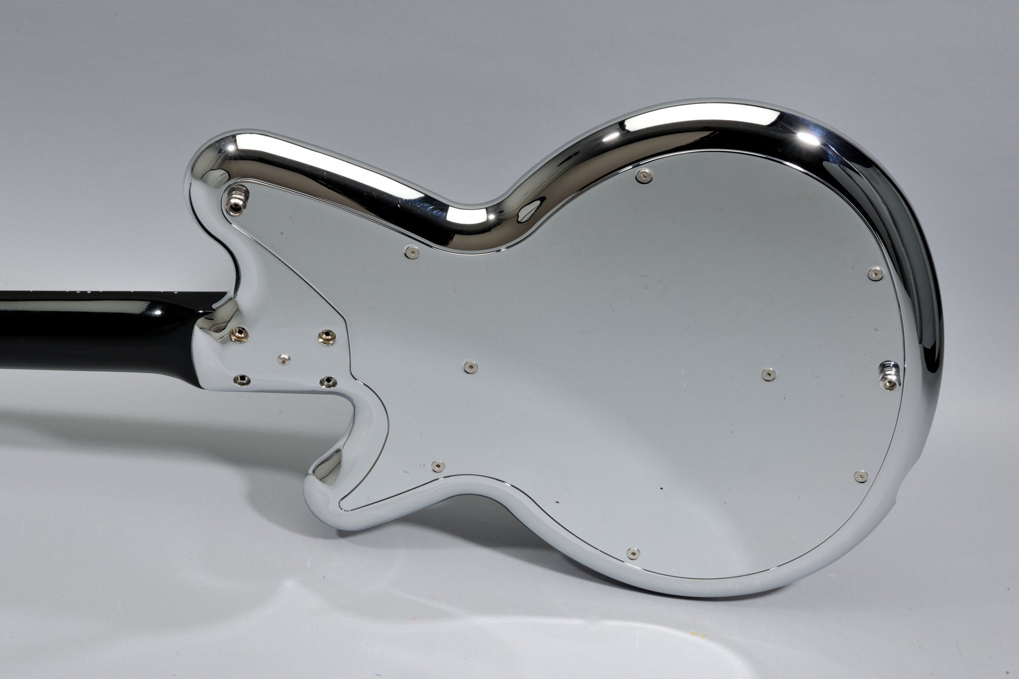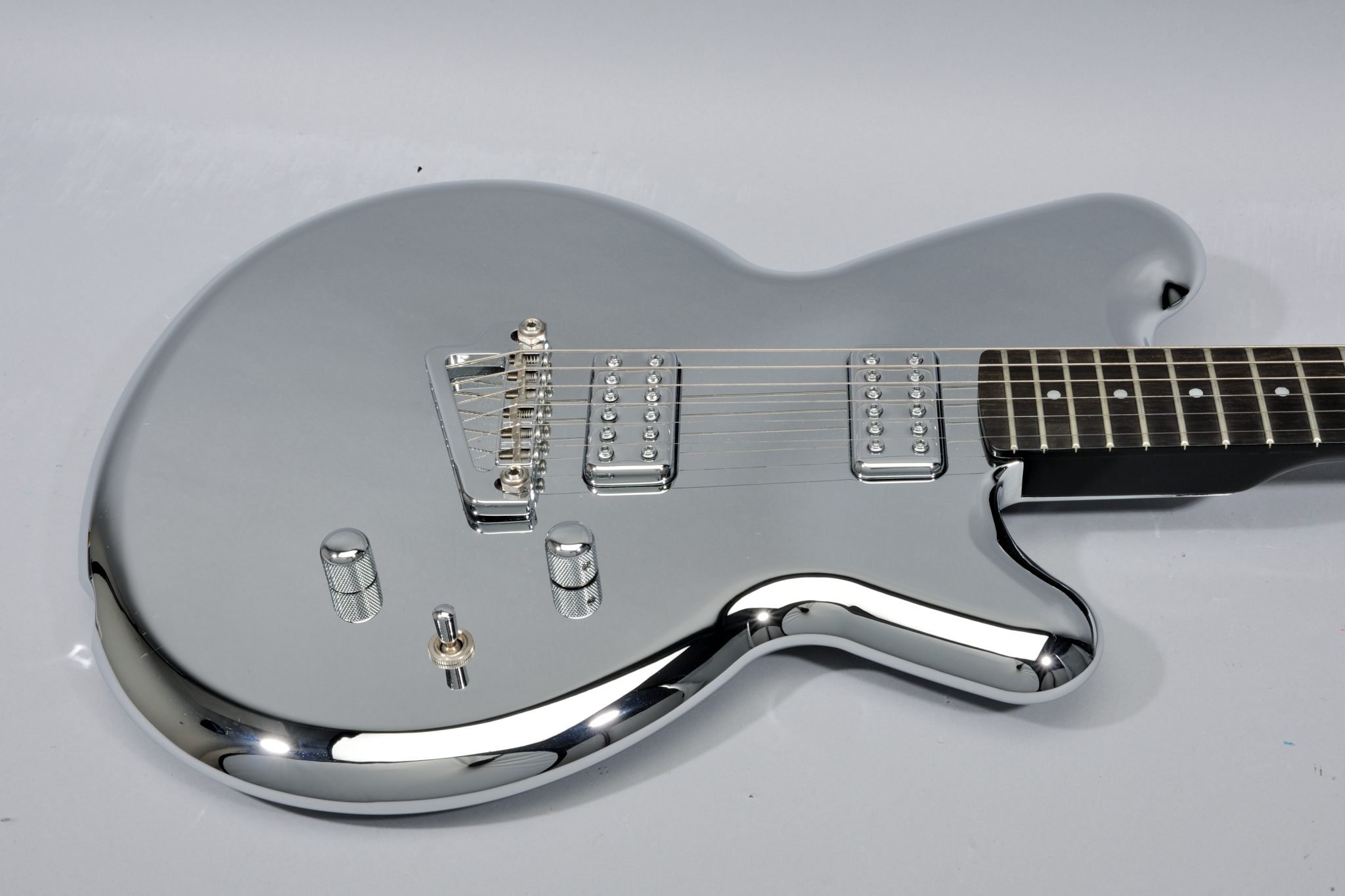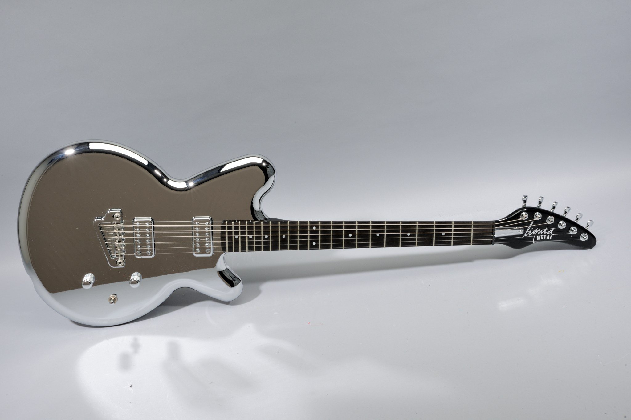 We build exceptional guitars. We build metal bodied guitars, that are either chrome, machined etched surface treatment or Harley Davidson candy paints for a look that is brilliant and bright and unique and cool. The one you are looking at now is our chromed beauty, the M1 T.V. Jones Premium.