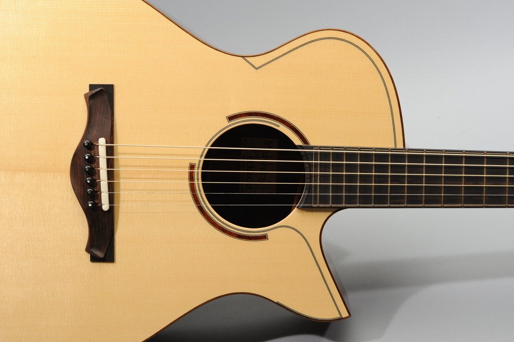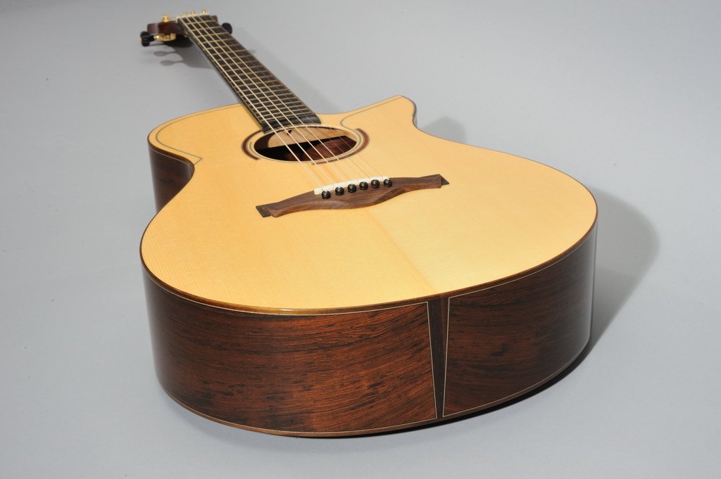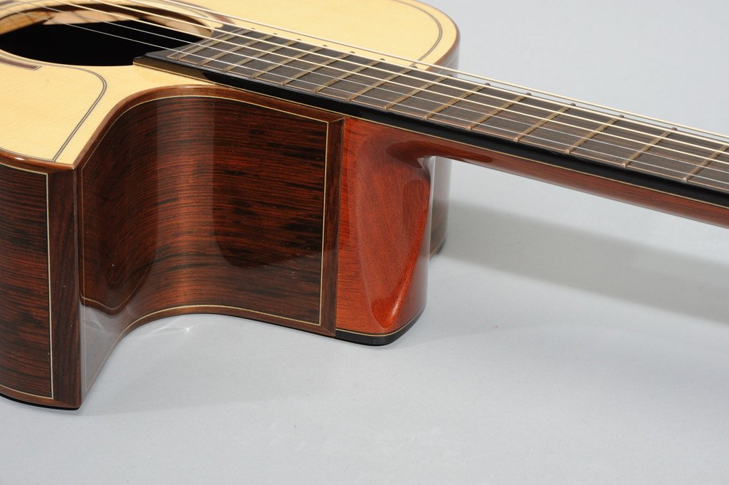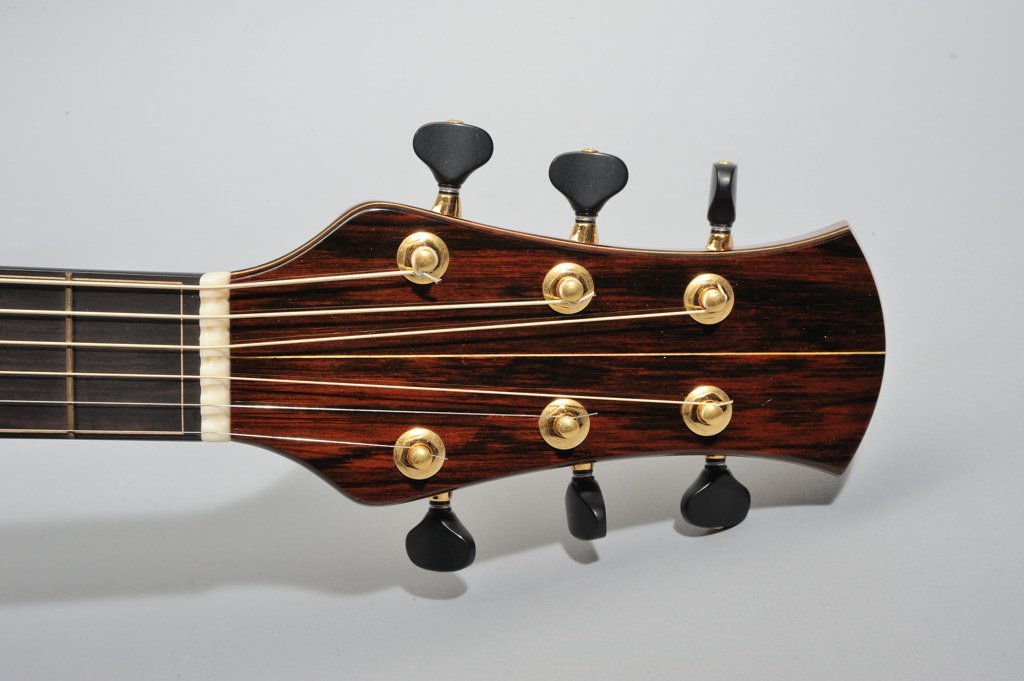 He also studied guitar restoration with the well-known instrument repairman Frank Ford, the co-owner of Gryphon Stringed Instruments. Matsuda spent about three years in Somogyi’s shop honing the guitar making skills he learned at Sakashta’s shop and at the Roberto-Venn School. He credits Somogyi, Sakashta, and Ford with helping him understand the structural complexities involved in hand building acoustic guitars. Matsuda is especially thankful to Somogyi for showing him the meaning of craftsmanship, and most importantly, teaching him the subtle art of making wood sing.