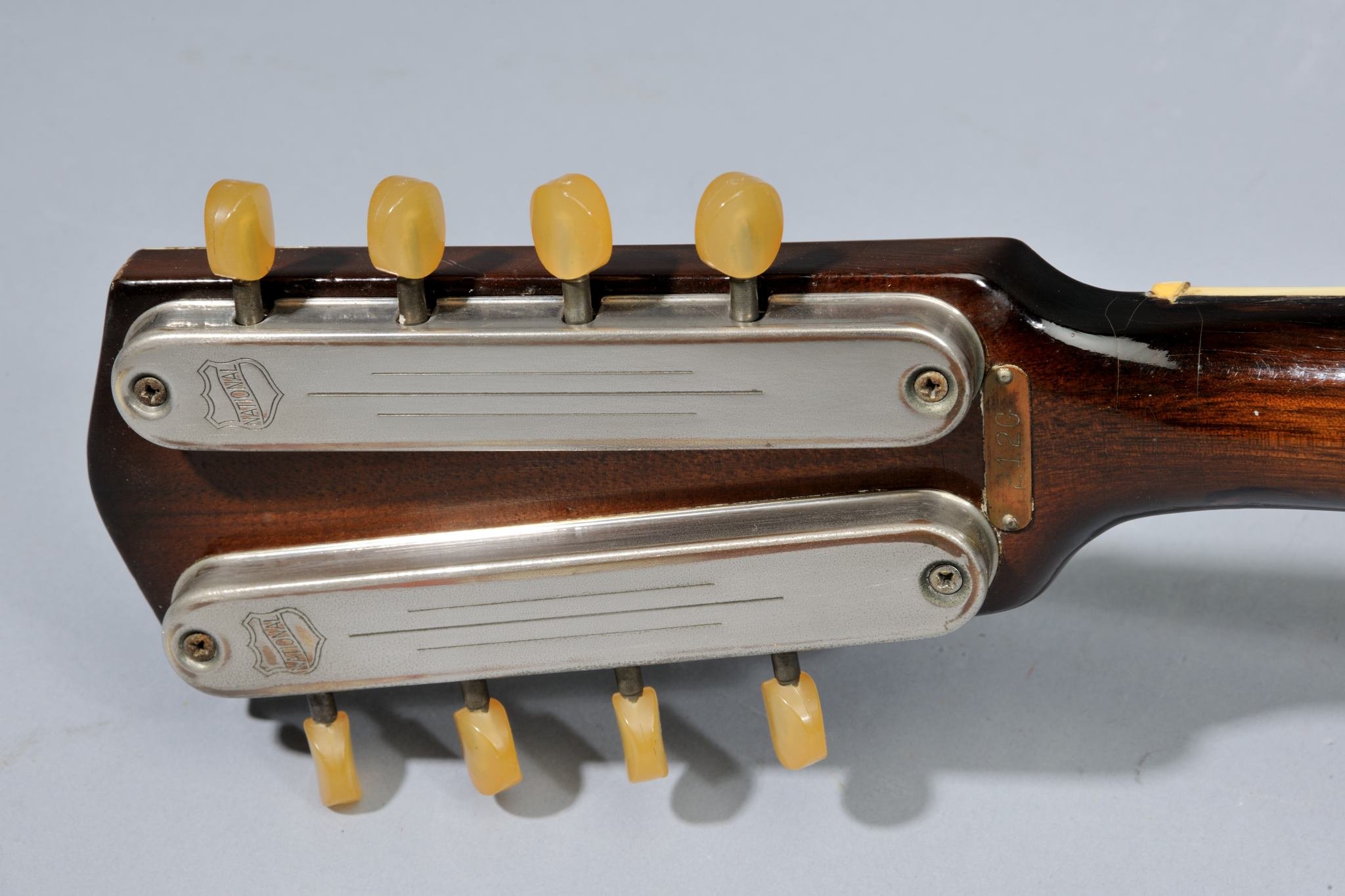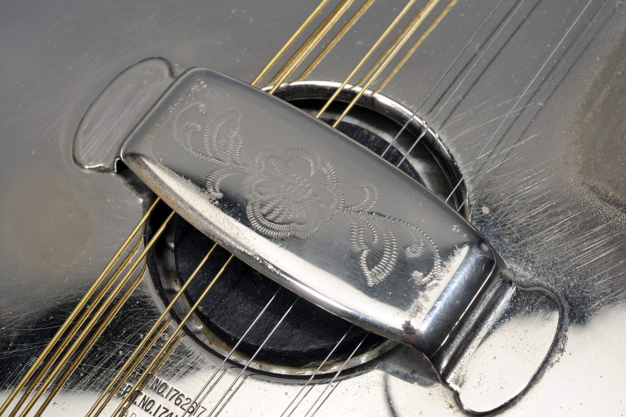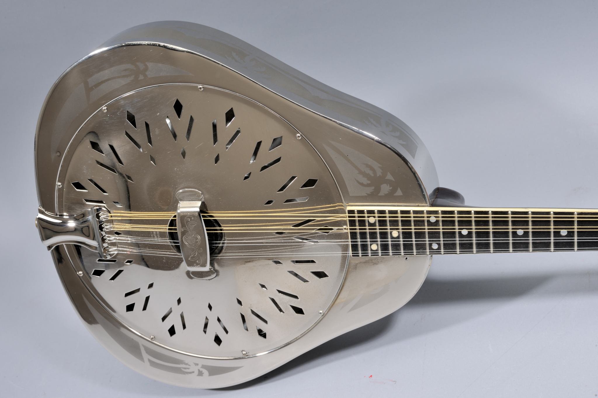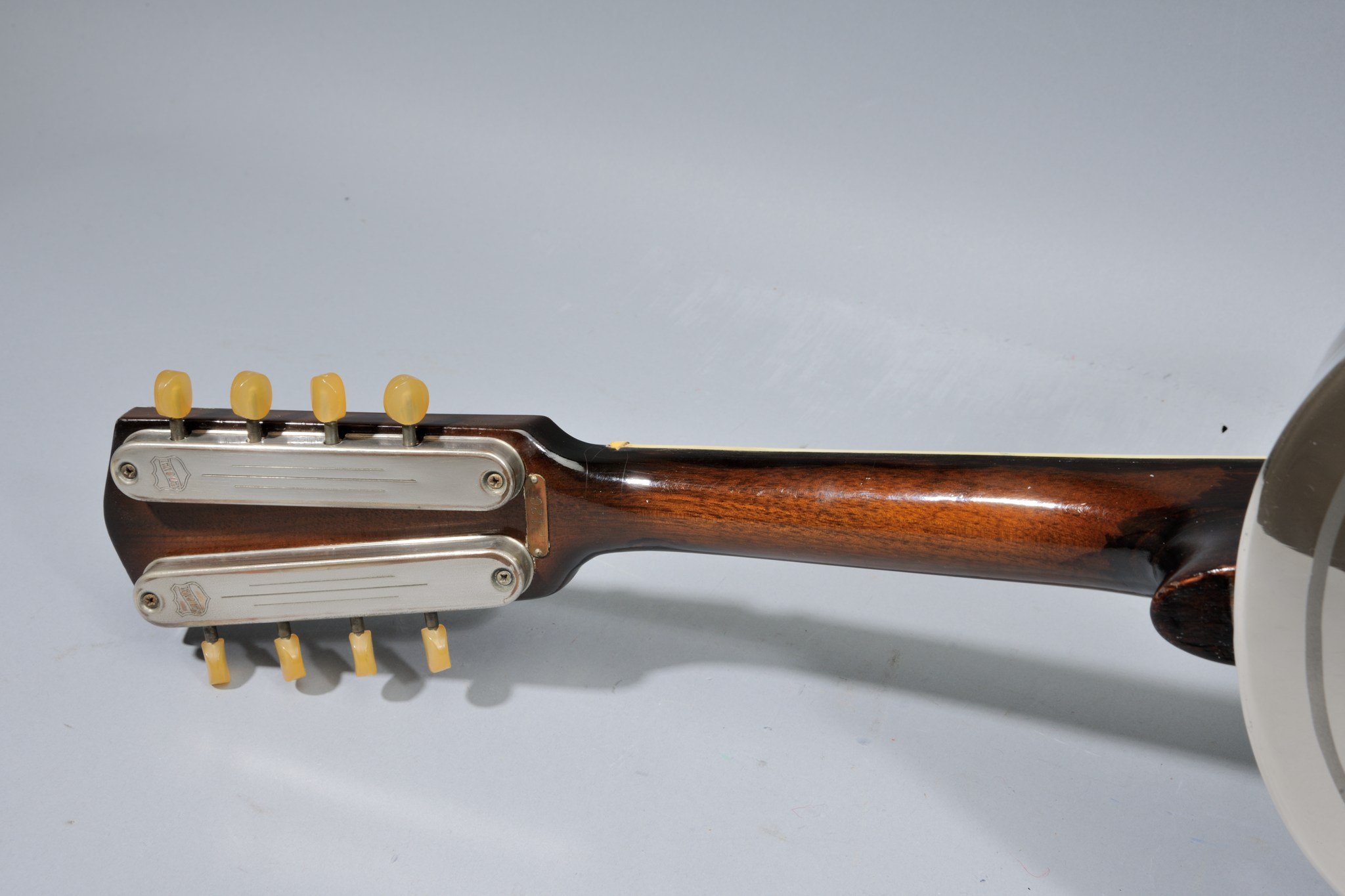 The tailpiece is shiny and could be chrome-plated. The serial number appears on a brass plaque behind the nut and the tuners are encased in two oblong gear covers, each bearing the National crest and logo and the three art-deco stripes; its original tuner buttons are caramel-colored pearloid. Uncommon pieces like this are fascinating and there really are not a lot of them in circulation. Heck, Brozman annotated only 3. National mandolins are among the loudest of all 8-stringed critters. Artistically, it sets itself apart from the enervated and the mundane – evoking a vision of the prewar era when ensembles were loud and only the stentorian could cut through. Its sound is that of string band music from a lost era, as heard on a 78-RPM record in a vision wherein the entire family is sitting around the wooden cabinet containing the radio, everyone dressed up in tattered yet serviceable clothing, the dominant color of which is gray.