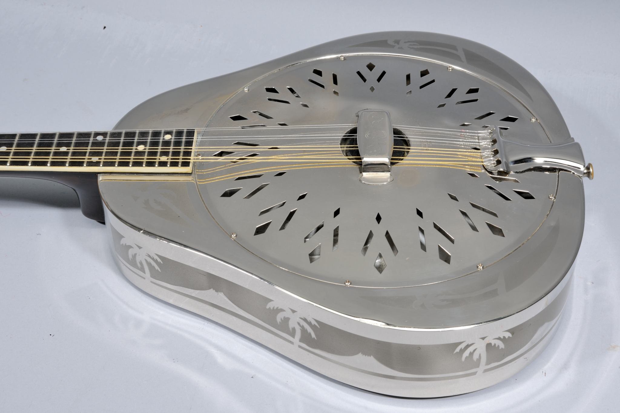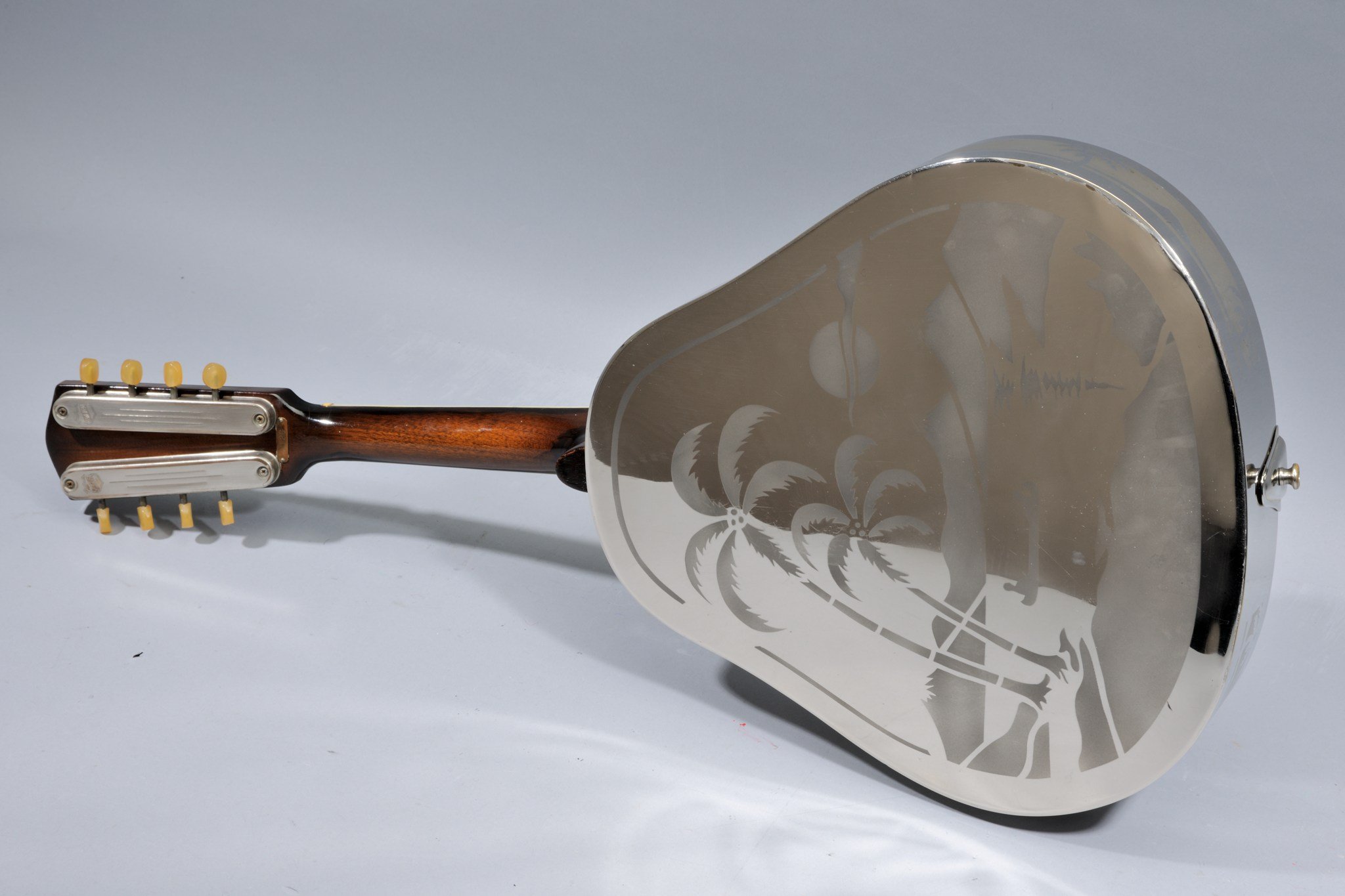 What makes this mandolin majestic, notwithstanding that it was already knightly just from being a nickel-plated brass-bodied semi-triangularly shaped body mandolin from the era of The Greatest Generation, is that it has a rose engraved on the cross piece that one’s hand rests on at the center of the cover plate, over the black biscuit bridge. In addition it has the sand-etched Hawaiian scenes on top, sides and back depicting the archipelago, the twin palm trees, the 3 inactive volcanoes, the dual canoeists, the clouds and the setting sun, and that’s just on the back, there’s also volcanoes and palm trees in a repeating pattern on the sides and at least 3 more trees on the front. This mandolin once had a pickguard, but that has long since gone to cellulose-nitrate heaven leaving behind a down-to-the-brass coloration to the upper treble bout and two screw holes in the metal. Said nickel-plated metal shows a few normal dings, light scratches and cloudiness – as one would expect – but the dark sunburst back of the mahogany neck, aside from a few crazing lines is quite amazingly clean, suggesting that this wasn’t played all that much. It bears the long scale of 14 7/8” (approximately), with a fretboard width of 1 3/16th which we deem the most comfortable width for a mandolin.