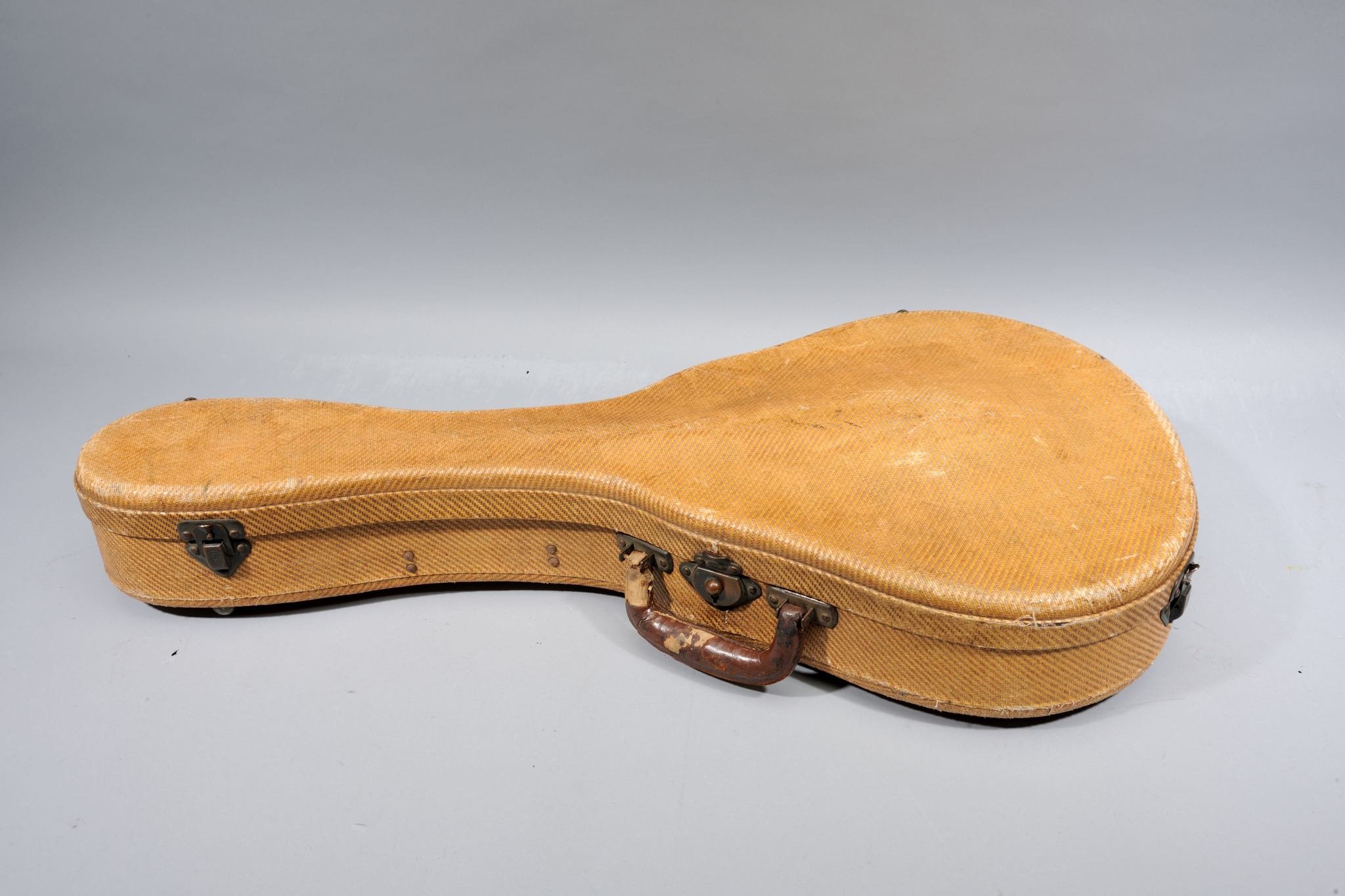 Per Bob Brozman, the “G” series of National prewar serial numbers dates from 1940 to 1941. Unbelievably enough, he actually lists this very mandolin – it’s on page 278 of his essential reference book about Nationals. He calls it a “#0 Mandolin Late Style.” There are two other mandolins listed in that section. By “late style” we believe he means that it has the “chicken feet” cover plate, just like the 14-fret Style O guitars such as the one that appears on the cover of Dire Strait’s Brothers in Arms. It has the celluloid-bordered ebony fingerboard, and the ivoroid bordered, polished black headplate bearing the National name in a parallelogram near the center of an ivoroid crest with the triple art deco “Chorus of Yums” appearing below. The cover plate is held in place by 9 roundhead Phillips screws starting at the 12 o’clock position.