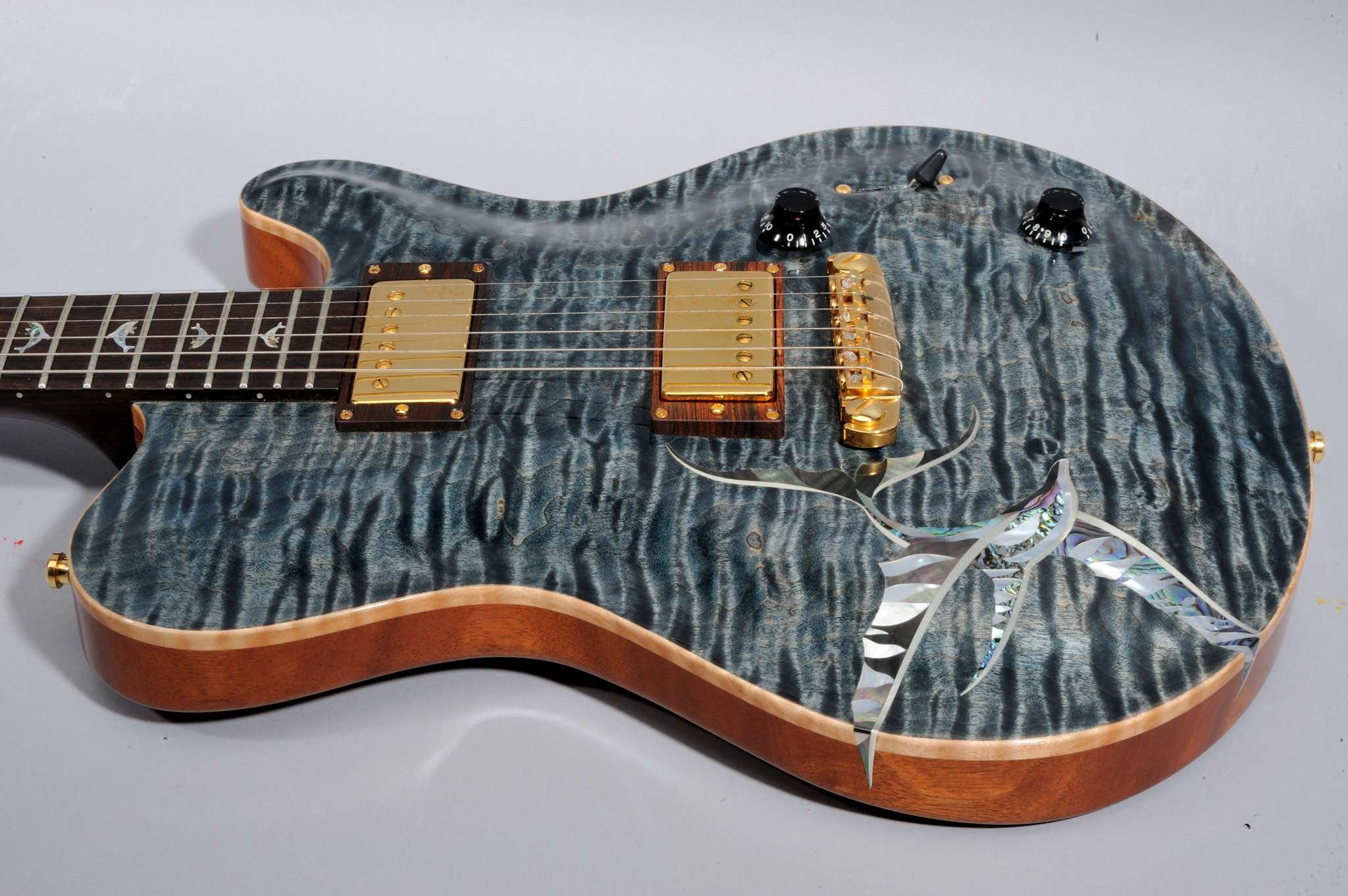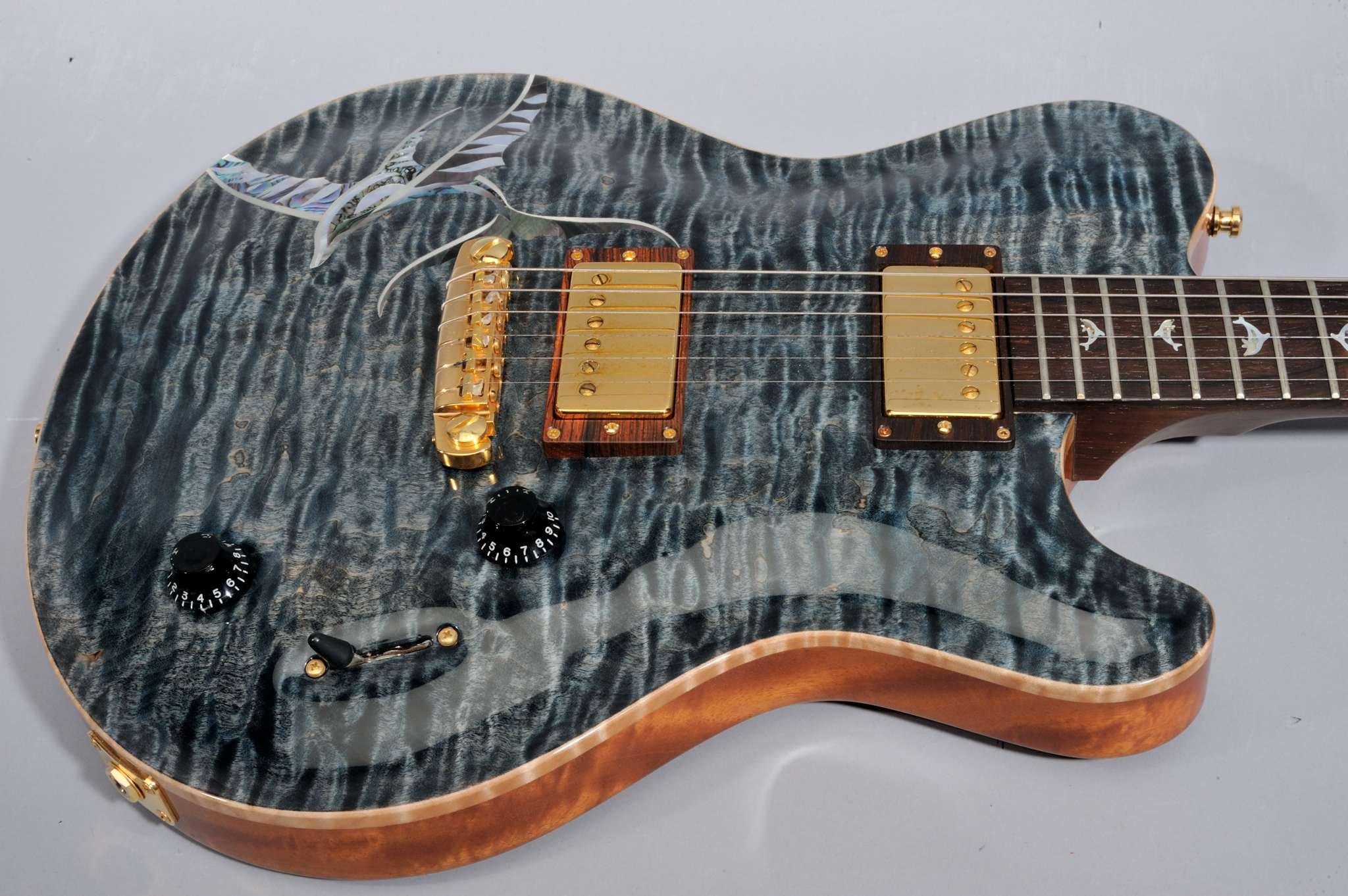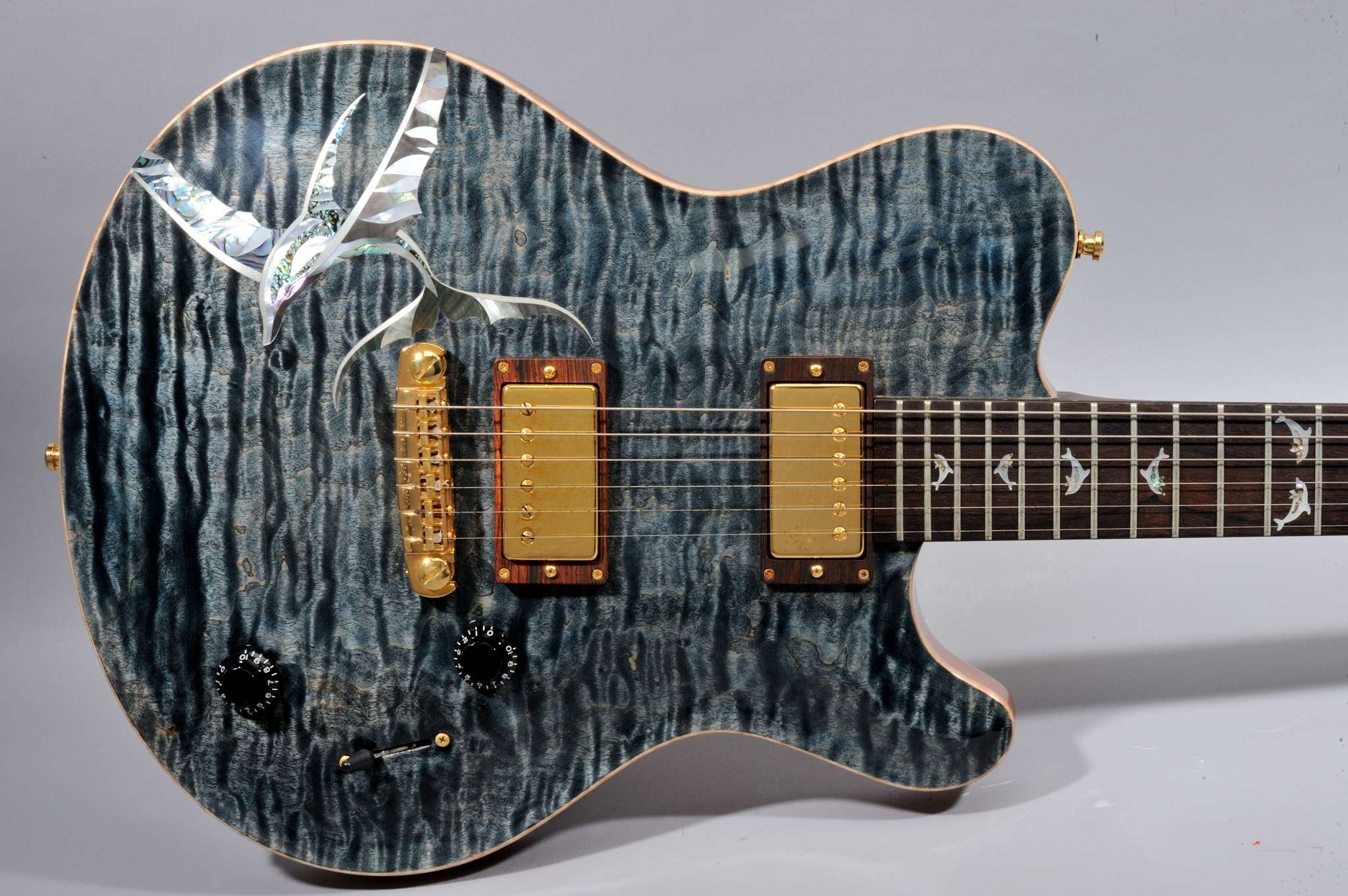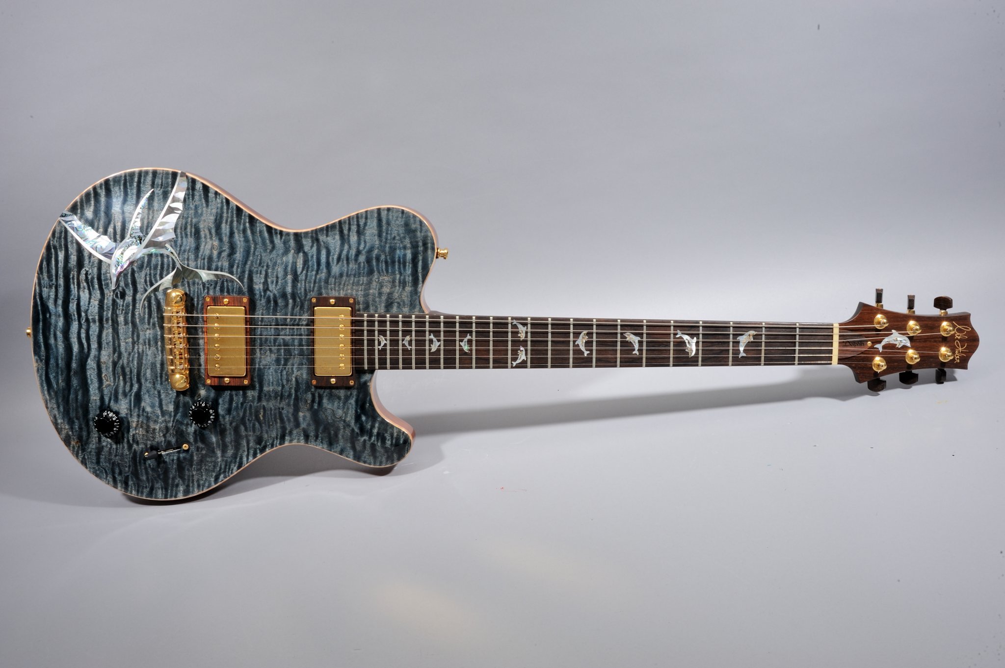 The Flying Dolphin includes an 85 piece Hand-cut Multi-Inlay made of Abalone, Black Pearl, Mother of Pearl, and Sterling Silver on the top of the body. Body inlays are very unique, and very difficult to build.