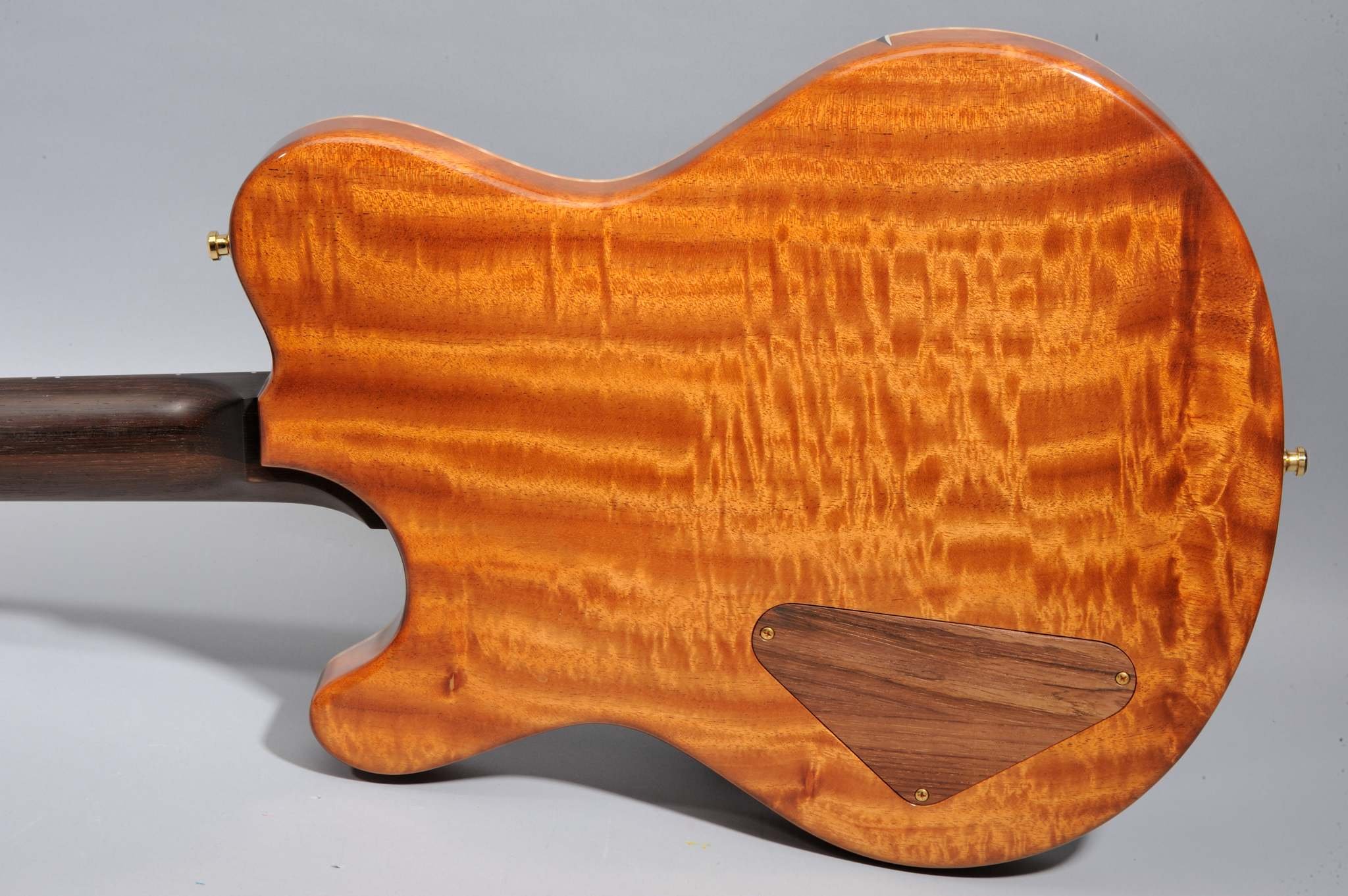 It is a double stained Atlantic Blue Dolphin with an exceptional 1-piece quilted maple top and a nicely flamed Mahogany body.