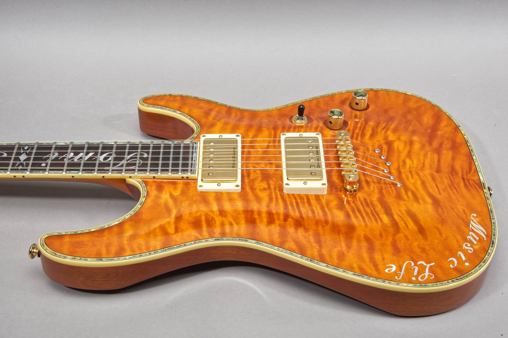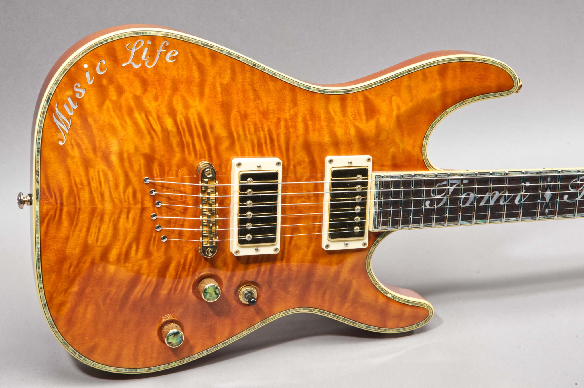 Tomi Fujiyama MOP Inlays on the Ebony Fretboard & Music Life Inlays on the body.