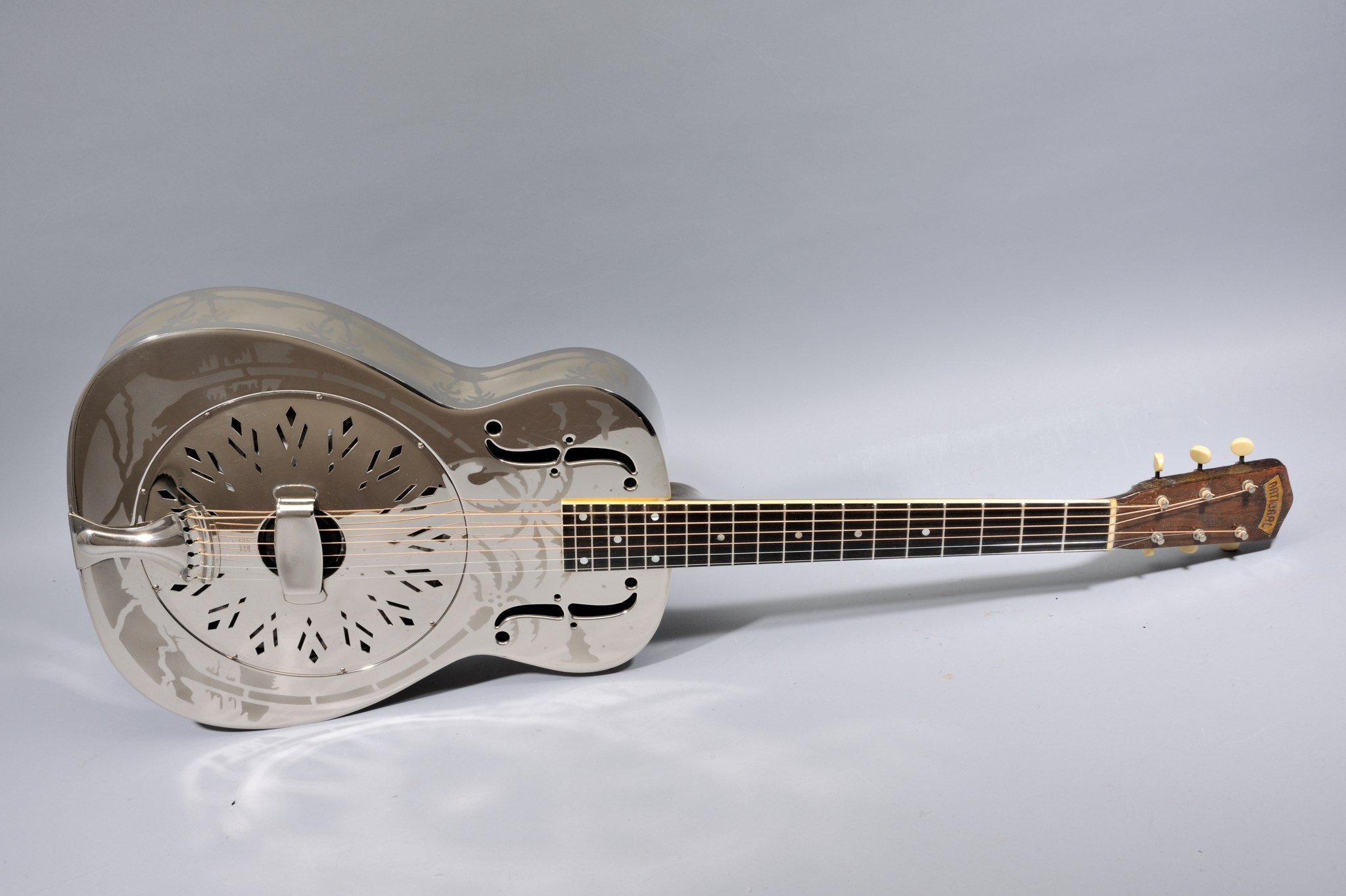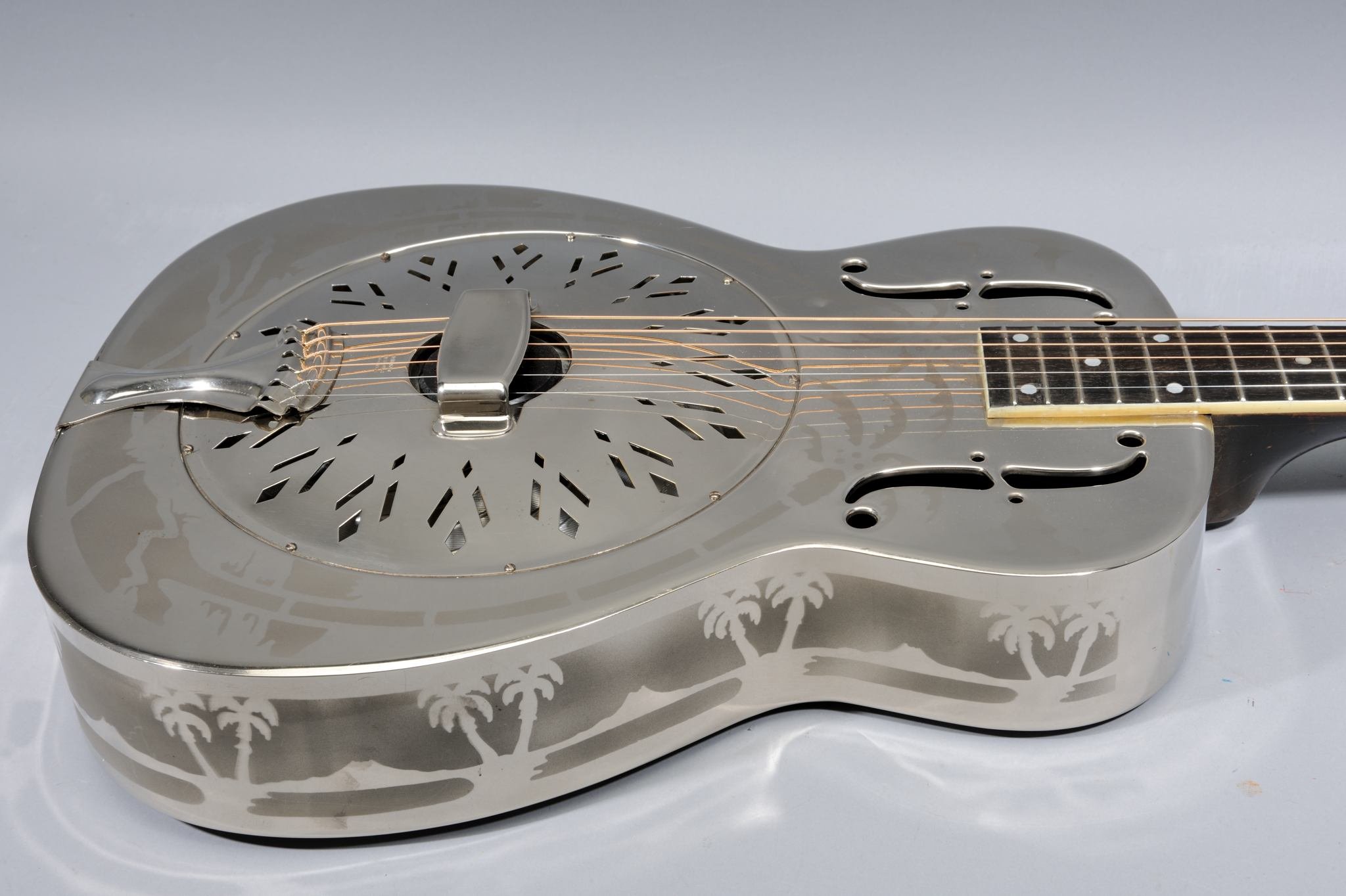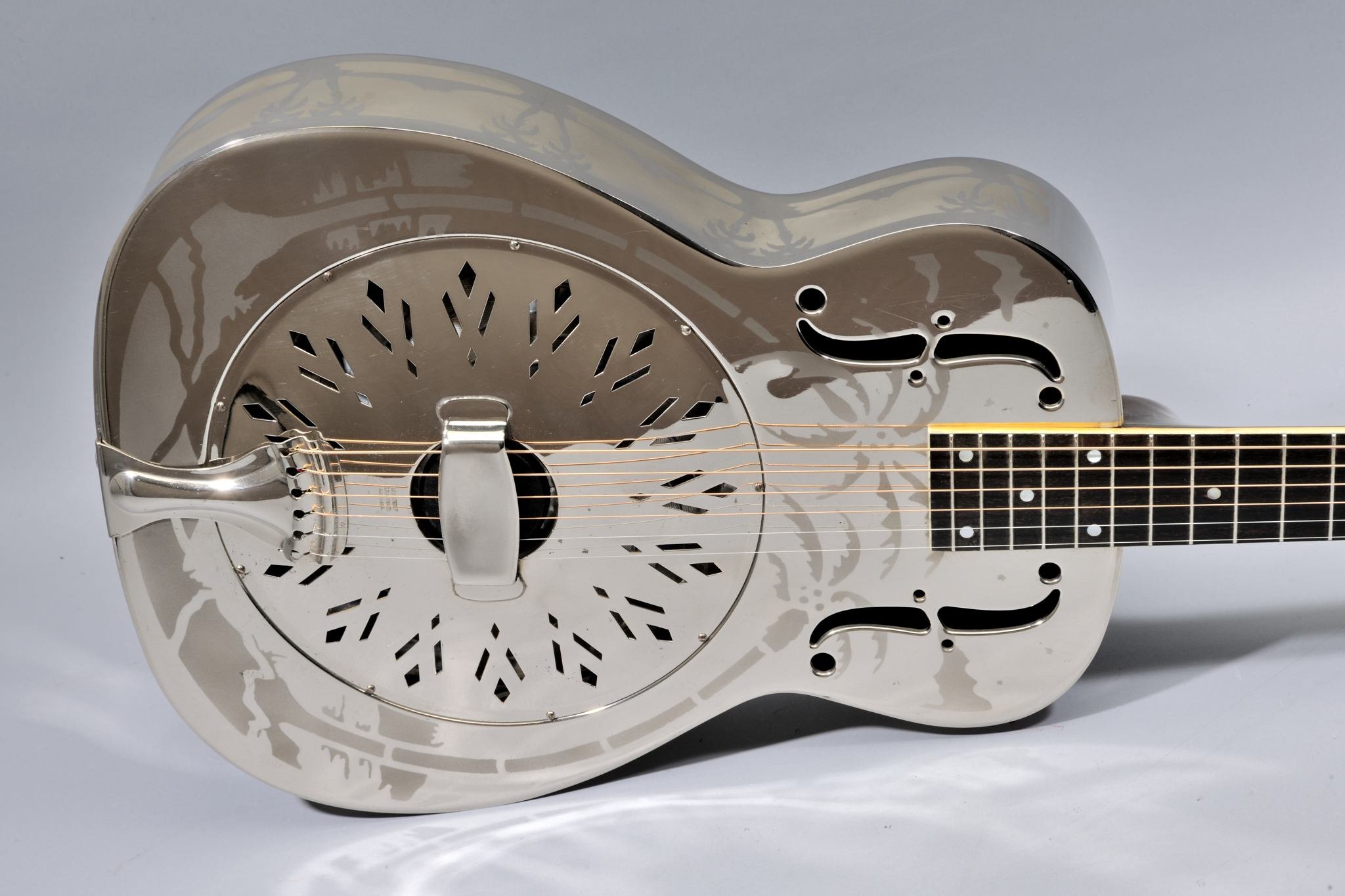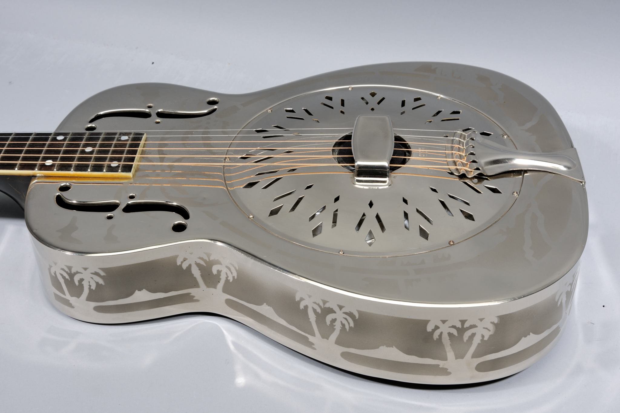 A National 1936 Style « O » round neck, the "never to be found" National Resonator with correct front & back scene versions, and palm trees sand blasted sides, set with Highlander IP-1X Inline pickup,