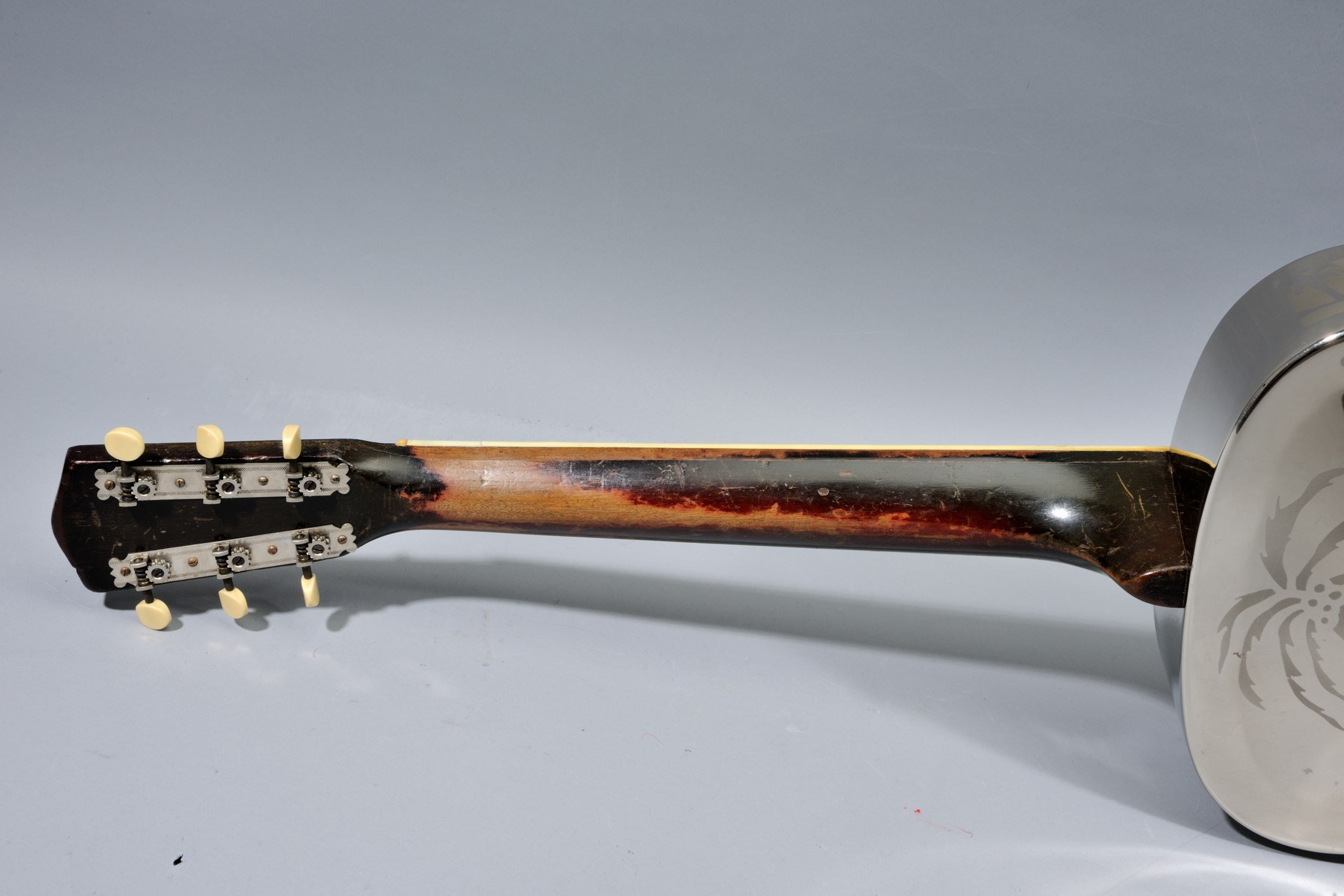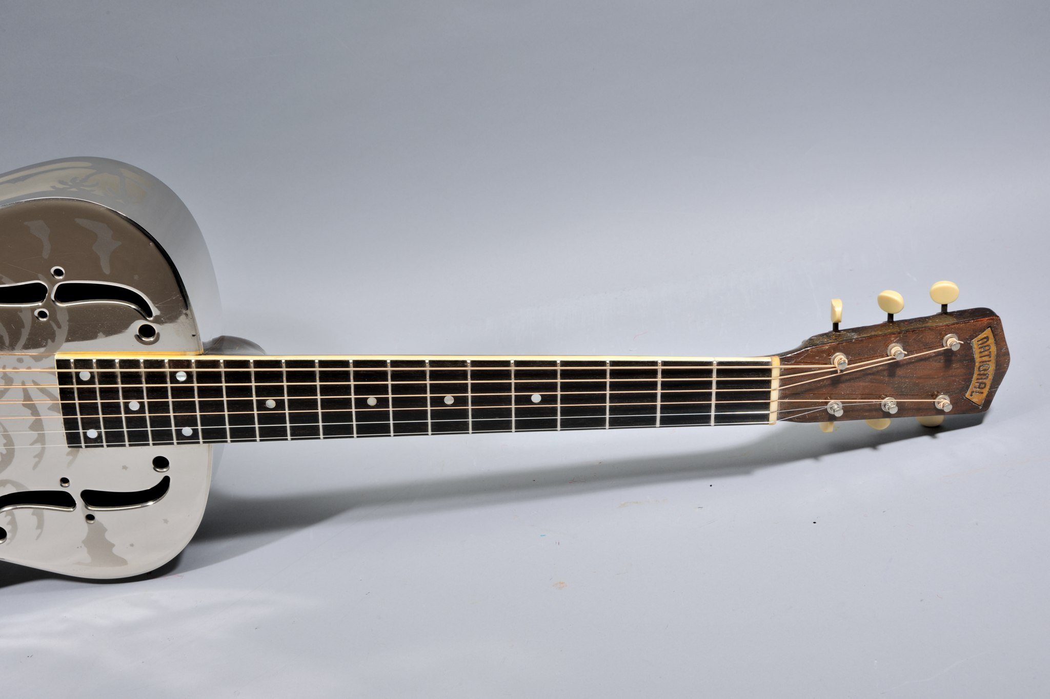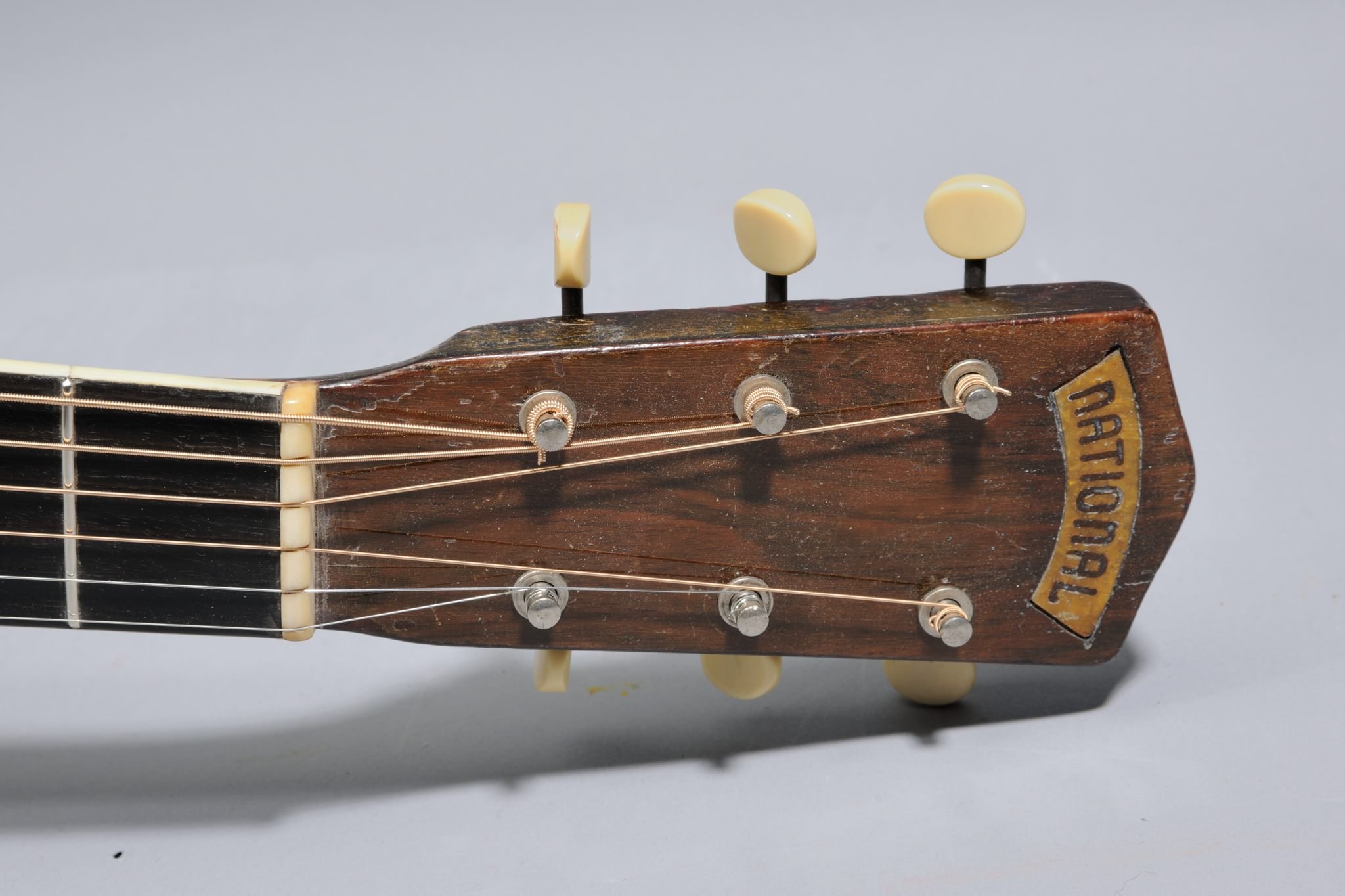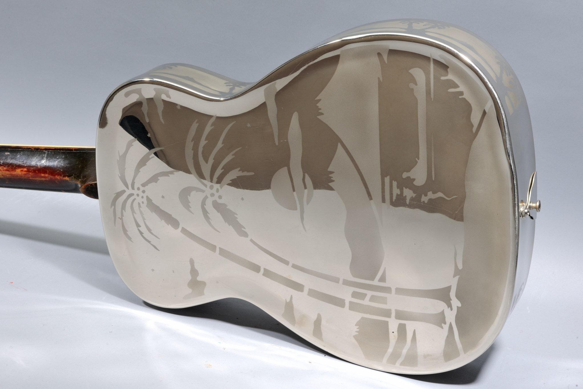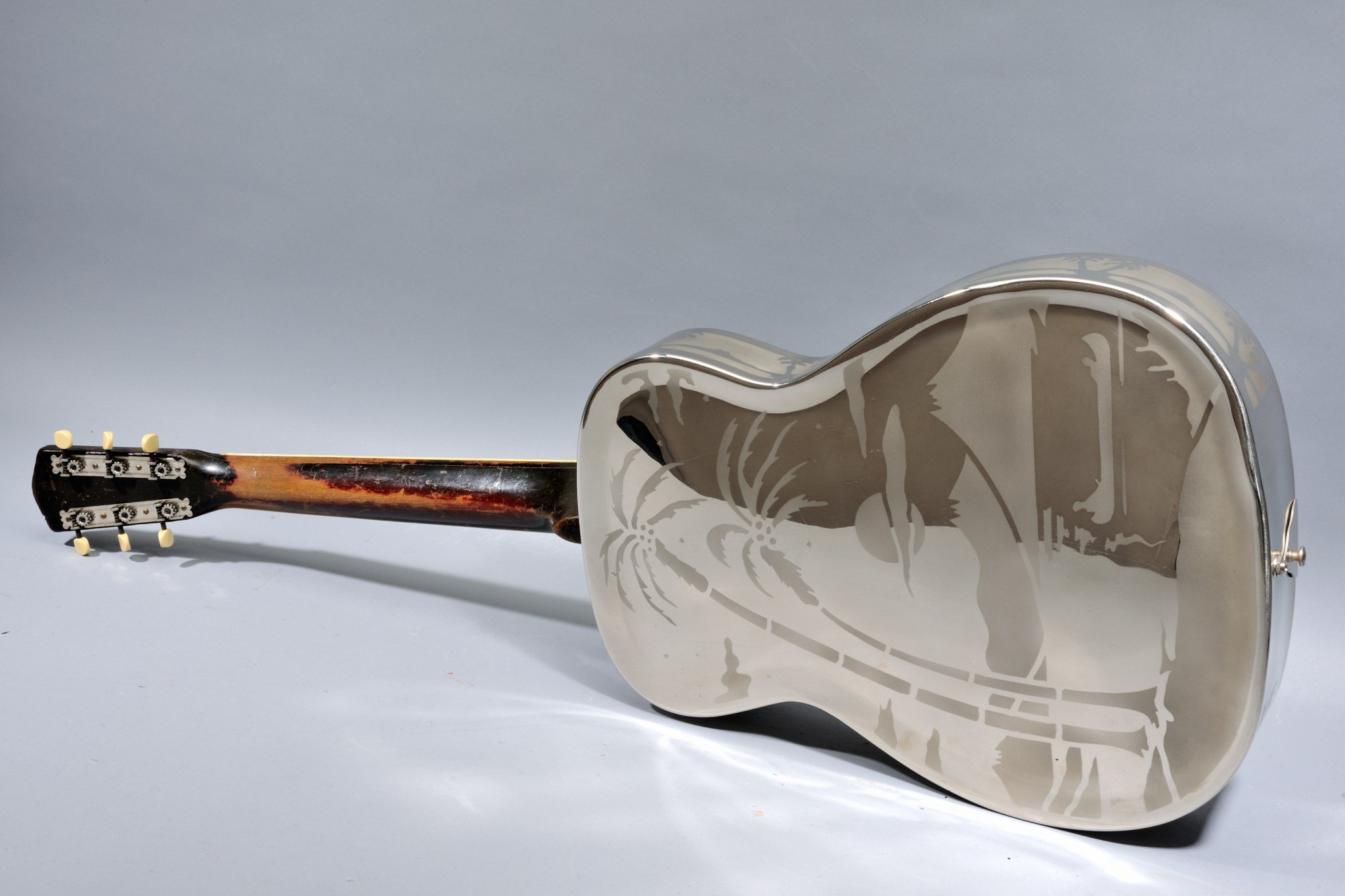 A National 1936 Style « O » round neck, the "never to be found" National Resonator with correct front & back scene versions, and palm trees sand blasted sides, set with Highlander IP-1X Inline pickup,