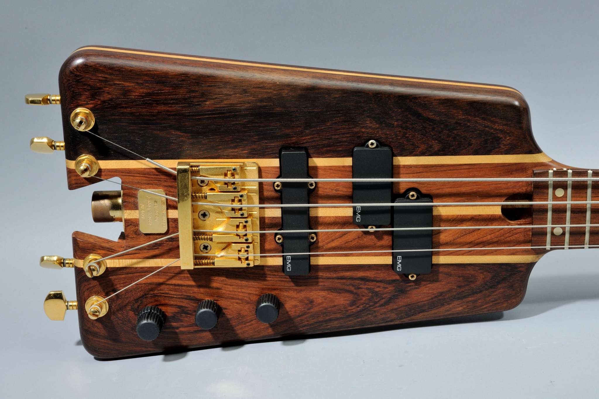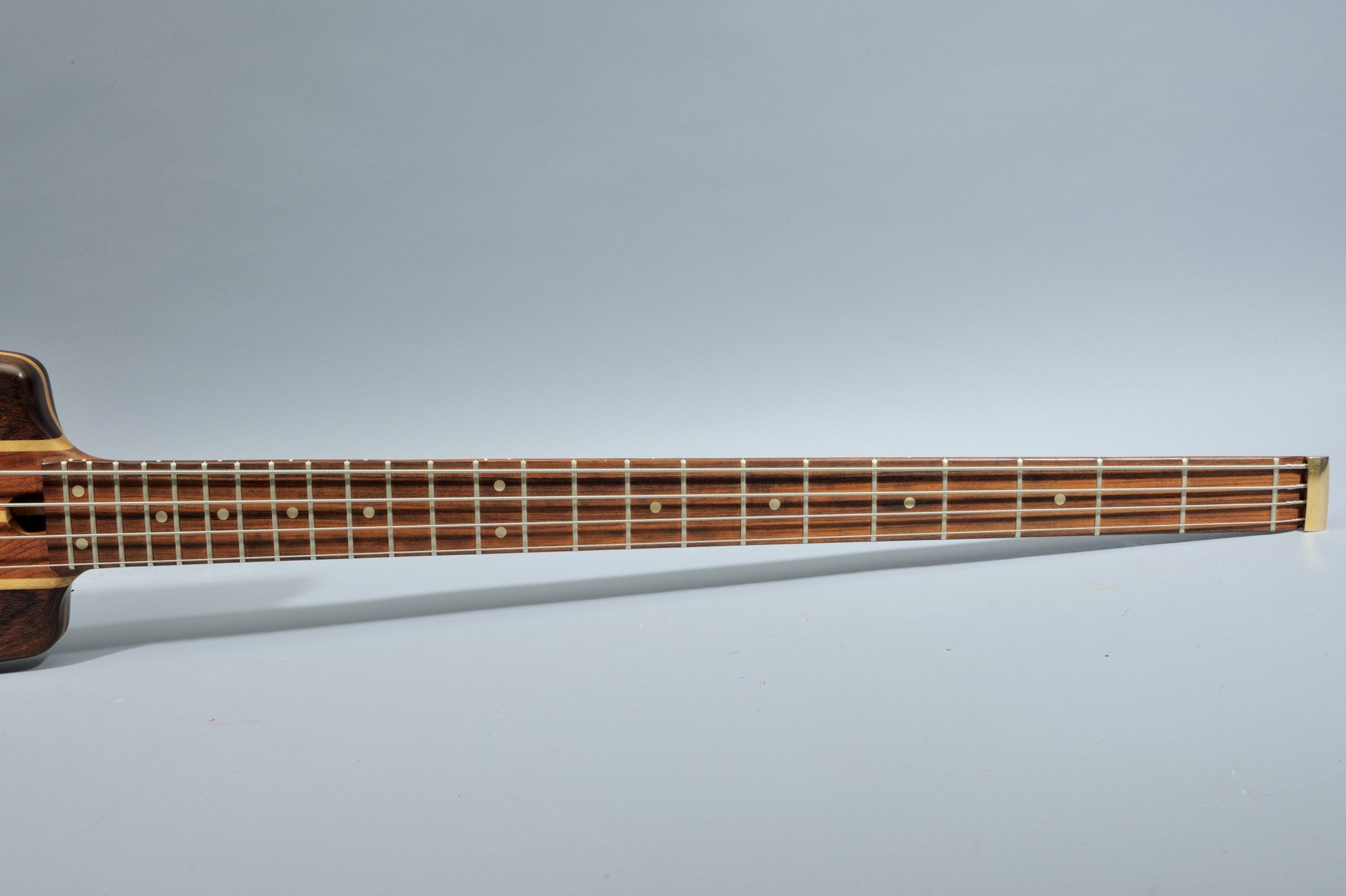 Nobby Meidel was absolutely pragmatic in the design phase of the new bass: he basically sawed off the headstock and lateral designs of the body to unmistakably make clear how he imagined the ideal headless electric bass. The Warwick boss himself created the hardware design and electronics; he even drew the schematics for the prototype. The brass parts were supplied by metal turner Walter Zeitler from Röslau, the rosewood came from a local lumber dealer, the 3-D bridges from Schaller in the town of Feucht, the pickups from Shadow in the town of Erlangen and the instrument’s finish was done at a specialty shop in the town of Eltersdorf. That’s how shortly thereafter a novel instrument, completely built in the Franconia region of Germany, came to market.